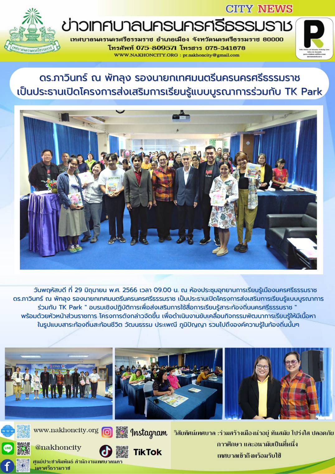 | วันพฤหัสบดี ที่ 29 มิถุนายน พ.ศ. 2566 เวลา 09.00 น. ณ ห้องประชุมอุทยานการเรียนรู้เมืองนครศรีธรรมราช ดร.ภาวินทร์ ณ พัทลุง รองนายกเทศมนตรีนครนครศรีธรรมราช เป็นประธานเปิดโครงการส่งเสริมการเรียนรู้แบบบูรณาการร่วมกับ TK Park " อบรมเชิงปฏิบัติการเพื่อส่งเสริมการใช้สื่อการเรียนรู้สาระท้องถิ่นนครศรีธรรมราช " พร้อมด้วยหัวหน้าส่วนราชการ โครงการดังกล่าวจัดขึ้น เพื่อดำเนินงานขับเคลื่อนกิจกรรมพัฒนาการเรียนรู้ให้มีเนื้อหาในรูปแบบสาระท้องถิ่นสะท้อนชีวิต วัฒนธรรม ประเพณี ภูมิปัญญา รวมไปถึงองค์ความรู้ในท้องถิ่นนั้นๆ |