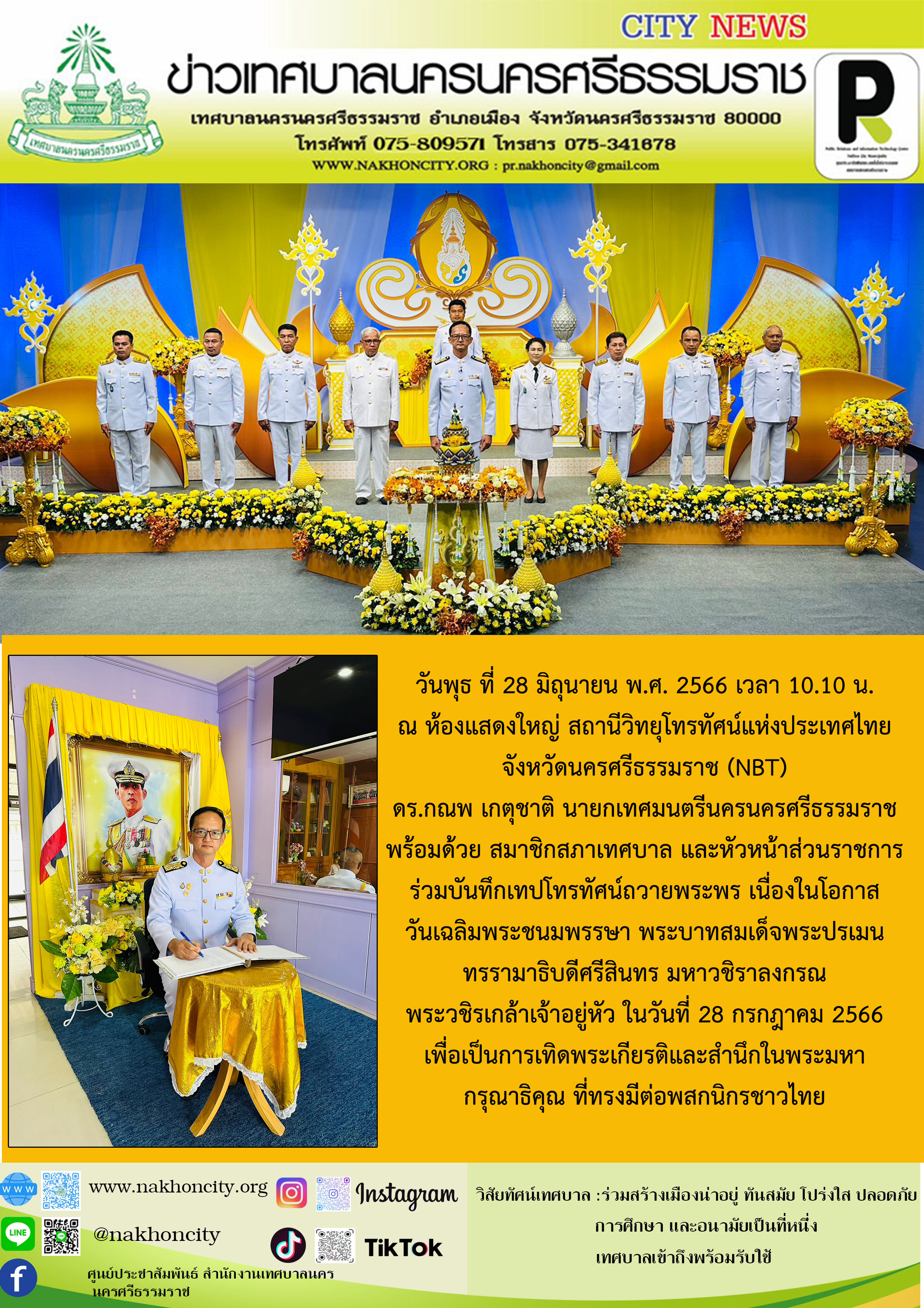 | ดร.กณพ เกตุชาติ นายกเทศมนตรีนครนครศรีธรรมราช พร้อมด้วย สมาชิกสภาเทศบาล และหัวหน้าส่วนราชการ ร่วมบันทึกเทปโทรทัศน์ถวายพระพร เนื่องในโอกาสวันเฉลิมพระชนมพรรษา พระบาทสมเด็จพระปรเมนทรรามาธิบดีศรีสินทร มหาวชิราลงกรณ พระวชิรเกล้าเจ้าอยู่หัว ในวันที่ 28 กรกฎาคม 2566 |