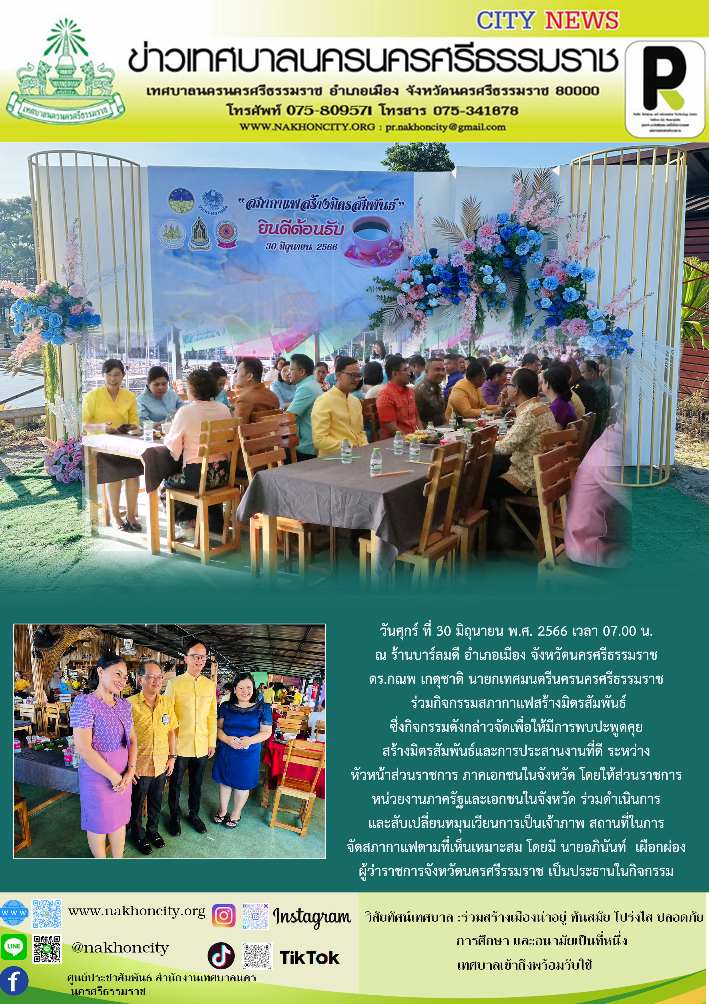 | ดร.กณพ เกตุชาติ นายกเทศมนตรีนครนครศรีธรรมราช ร่วมกิจกรรมสภากาแฟสร้างมิตรสัมพันธ์ ซึ่งกิจกรรมดังกล่าวจัดเพื่อให้มีการพบปะพูดคุย สร้างมิตรสัมพันธ์และการประสานงานที่ดี ระหว่างหัวหน้าส่วนราชการ ภาคเอกชนในจังหวัด |