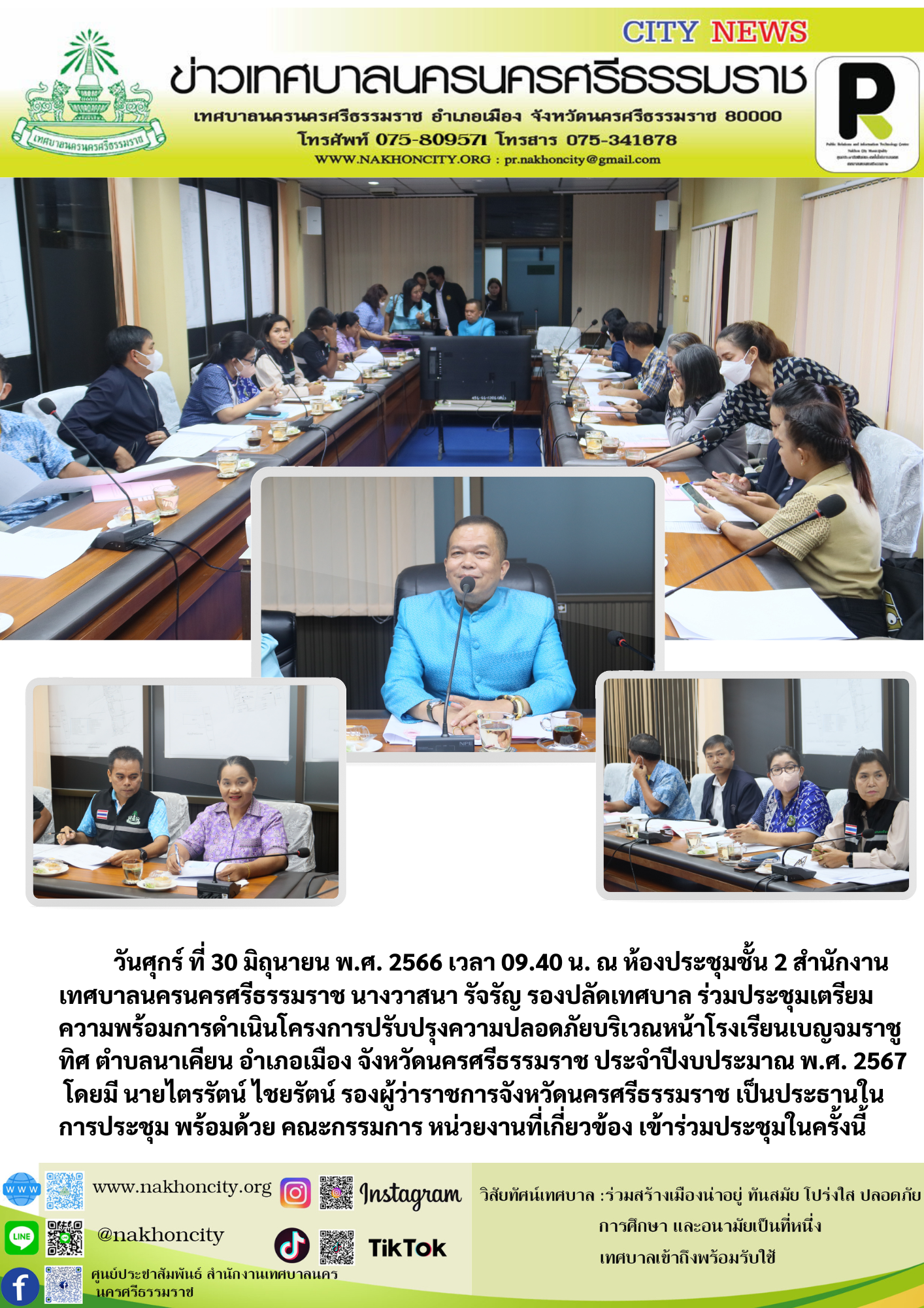 | วันศุกร์ ที่ 30 มิถุนายน พ.ศ. 2566 เวลา 09.40 น. ณ ห้องประชุมชั้น 2 สำนักงานเทศบาลนครนครศรีธรรมราช นางวาสนา รัจรัญ รองปลัดเทศบาล ร่วมประชุมเตรียมความพร้อมการดำเนินโครงการปรับปรุงความปลอดภัยบริเวณหน้าโรงเรียนเบญจมราชูทิศ ตำบลนาเคียน อำเภอเมือง จังหวัดนครศรีธรรมราช ประจำปีงบประมาณ พ.ศ. 2567 โดยมี นายไตรรัตน์ ไชยรัตน์ รองผู้ว่าราชการจังหวัดนครศรีธรรมราช เป็นประธานในการประชุม พร้อมด้วย คณะกรรมการ หน่วยงานที่เกี่ยวข้อง เข้าร่วมประชุมในครั้งนี้