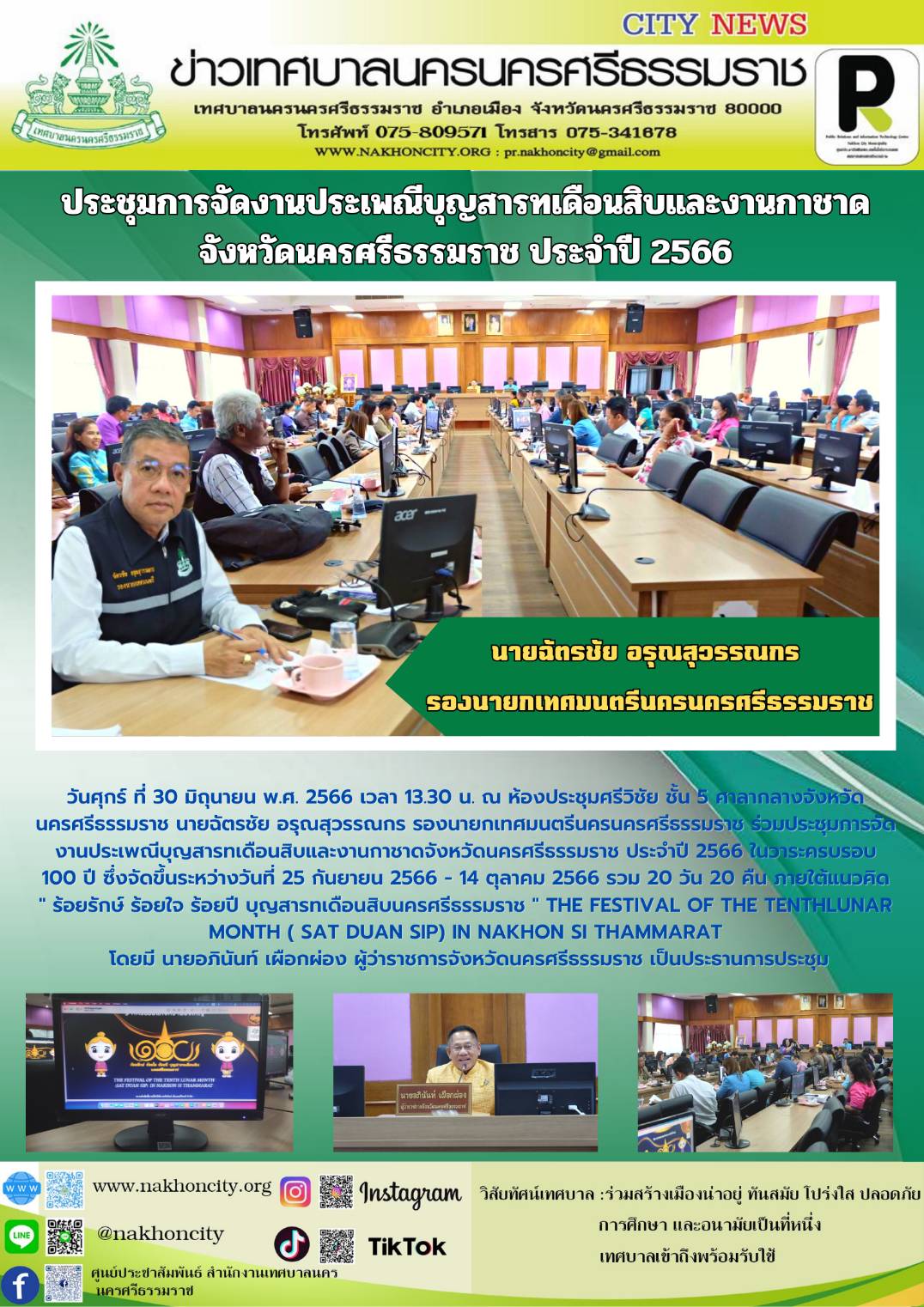 | วันศุกร์ ที่ 30 มิถุนายน พ.ศ. 2566 เวลา 13.30 น. ณ ห้องประชุมศรีวิชัย ชั้น 5 ศาลากลางจังหวัดนครศรีธรรมราช นายฉัตรชัย อรุณสุวรรณกร รองนายกเทศมนตรีนครนครศรีธรรมราช ร่วมประชุมการจัดงานประเพณีบุญสารทเดือนสิบและงานกาชาดจังหวัดนครศรีธรรมราช ประจำปี 2566 ในวาระครบรอบ 100 ปี ซึ่งจัดขึ้นระหว่างวันที่ 25 กันยายน 2566 - 14 ตุลาคม 2566 รวม 20 วัน 20 คืน  ภายใต้แนวคิด " ร้อยรักษ์ ร้อยใจ ร้อยปี บุญสารทเดือนสิบนครศรีธรรมราช " THE FESTIVAL OF THE TENTHLUNAR MONTH ( SAT DUAN SIP) IN NAKHON SI THAMMARAT |