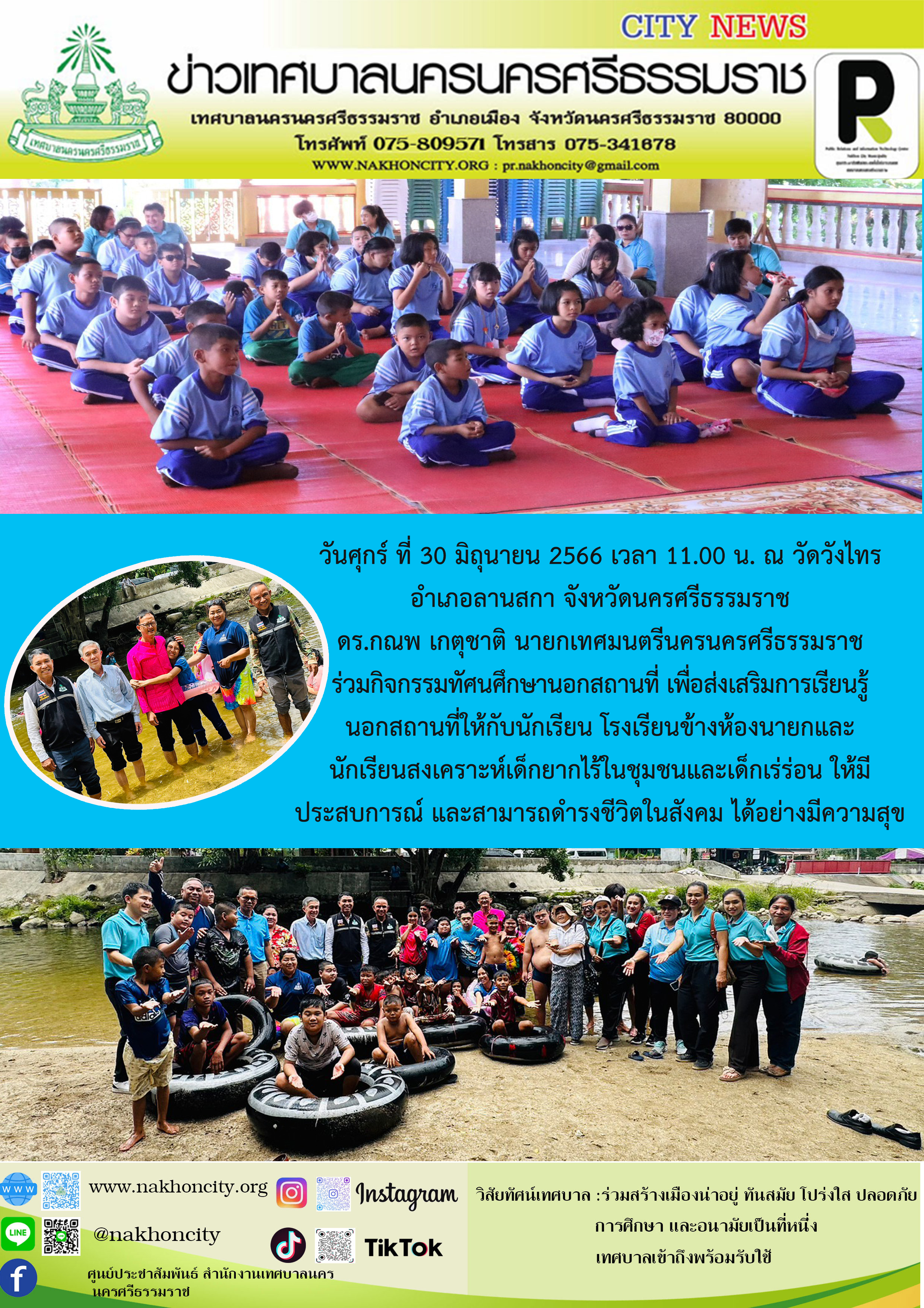 | ดร.กณพ เกตุชาติ นายกเทศมนตรีนครนครศรีธรรมราช ร่วมกิจกรรมทัศนศึกษานอกสถานที่ เพื่อส่งเสริมการเรียนรู้นอกสถานที่ให้กับนักเรียนโรงเรียนข้างห้องนายกและนักเรียนสงเคราะห์เด็กยากไร้ในชุมชนและเด็กเร่ร่อน ให้มีประสบการณ์ และสามารถดำรงชีวิตในสังคมได้อย่างมีความสุข |