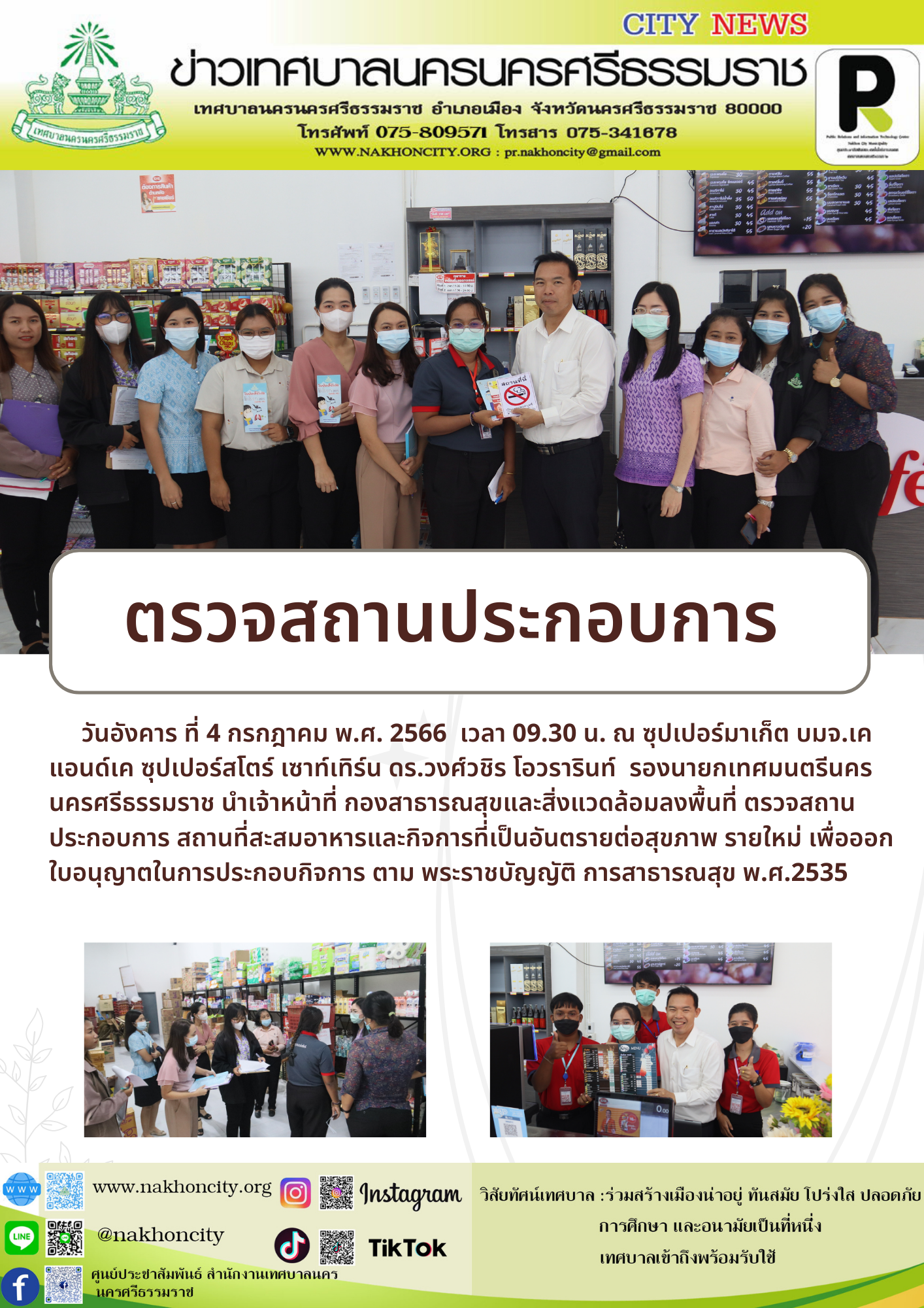 | ดร.วงศ์วชิร โอวรารินท์ รองนายกเทศมนตรีนครนครศรีธรรมราช นำเจ้าหน้าที่ กองสาธารณสุขและสิ่งแวดล้อมลงพื้นที่ ตรวจสถานประกอบการ |