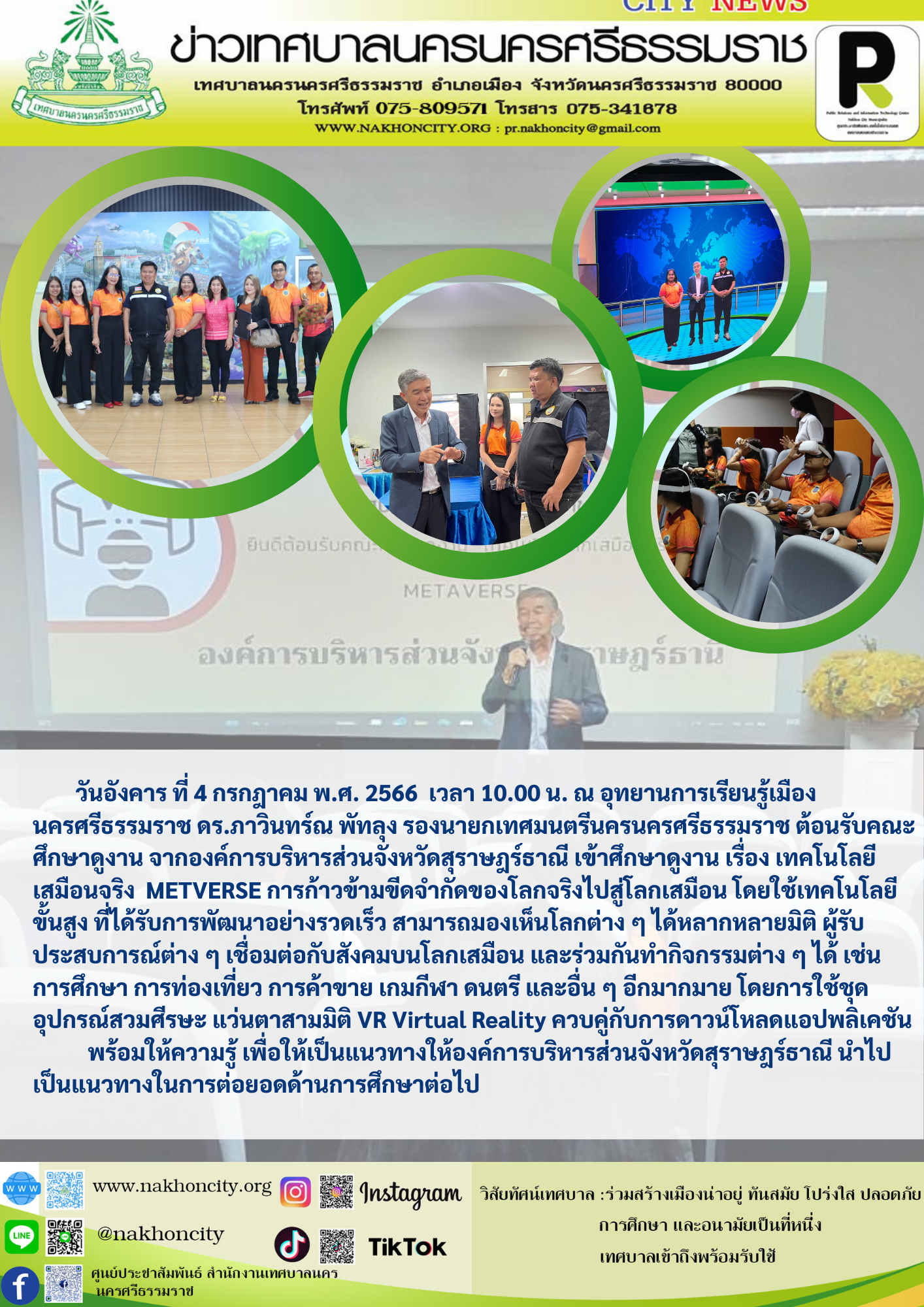 | วันอังคาร ที่ 4 กรกฎาคม พ.ศ. 2566 เวลา 10.00 น. ณ อุทยานการเรียนรู้เมืองนครศรีธรรมราช ดร.ภาวินทร์ ณ พัทลุง รองนายกเทศมนตรีนครนครศรีธรรมราช ต้อนรับคณะศึกษาดูงาน จากองค์การบริหารส่วนจังหวัดสุราษฎร์ธาณี เข้าศึกษาดูงาน เรื่อง เทคโนโลยีเสมือนจริง METVERSE การก้าวข้ามขีดจำกัดของโลกจริงไปสู่โลกเสมือน โดยใช้เทคโนโลยีขั้นสูง ที่ได้รับการพัฒนาอย่างรวดเร็ว สามารถมองเห็นโลกต่าง ๆ ได้หลากหลายมิติ ผู้รับประสบการณ์ต่าง ๆ เชื่อมต่อกับสังคมบนโลกเสมือน และร่วมกันทำกิจกรรมต่าง ๆ ได้ เช่น การศึกษา การท่องเที่ยว การค้าขาย เกมกีฬา ดนตรี และอื่น ๆ อีกมากมาย โดยการใช้ชุดอุปกรณ์สวมศีรษะ แว่นตาสามมิติ VR Virtual Reality ควบคู่กับการดาวน์โหลดแอปพลิเคชันพร้อมให้ความรู้ เพื่อให้เป็นแนวทางให้องค์การบริหารส่วนจังหวัดสุราษฎร์ธาณี นำไปเป็นแนวทางในการต่อยอดด้านการศึกษาต่อไปข่าว/แสงจันทร์ |