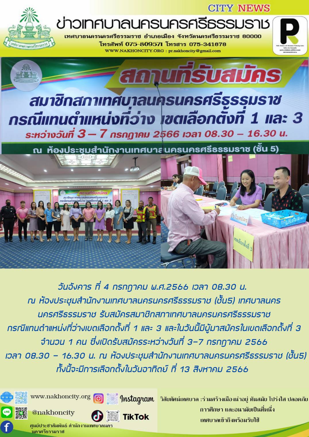 | เทศบาลนครนครศรีธรรมราช รับสมัครสมาชิกสภาเทศบาลนครนครศรีธรรมราช กรณีแทนตำแหน่งที่ว่าง เขตเลือกตั้งที่ 1 และ 3 |