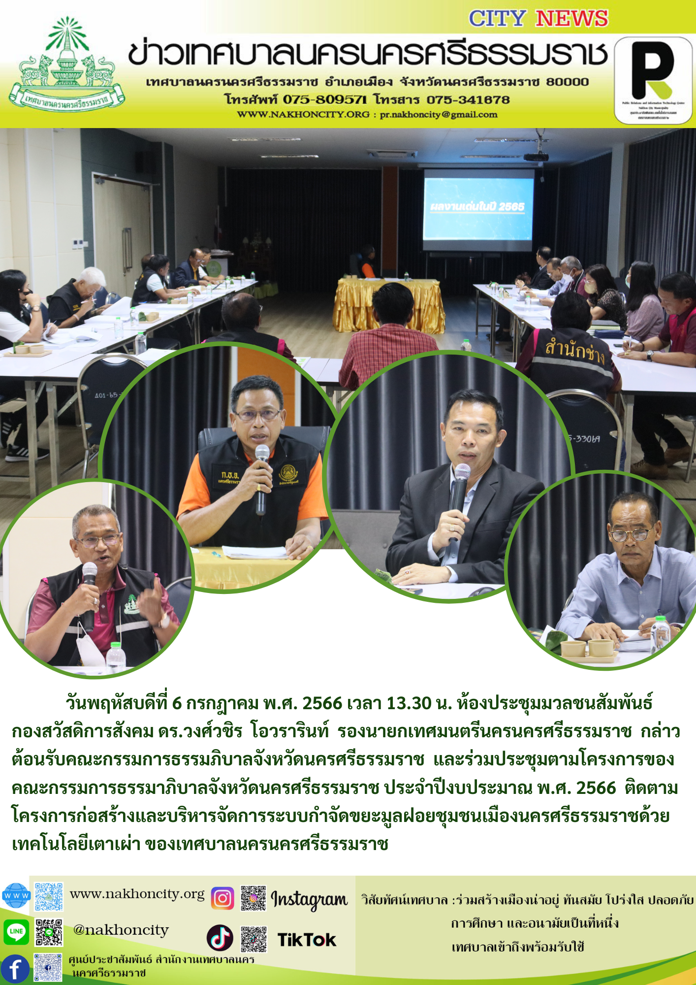 | ดร.วงศ์วชิร โอวรารินท์ รองนายกเทศมนตรีนครนครศรีธรรมราช กล่าวต้อนรับคณะกรรมการธรรมภิบาลจังหวัดนครศรีธรรมราช และร่วมประชุมตามโครงการของคณะกรรมการธรรมาภิบาลจังหวัดนครศรีธรรมราช ประจำปีงบประมาณ พ.ศ. 2566 |