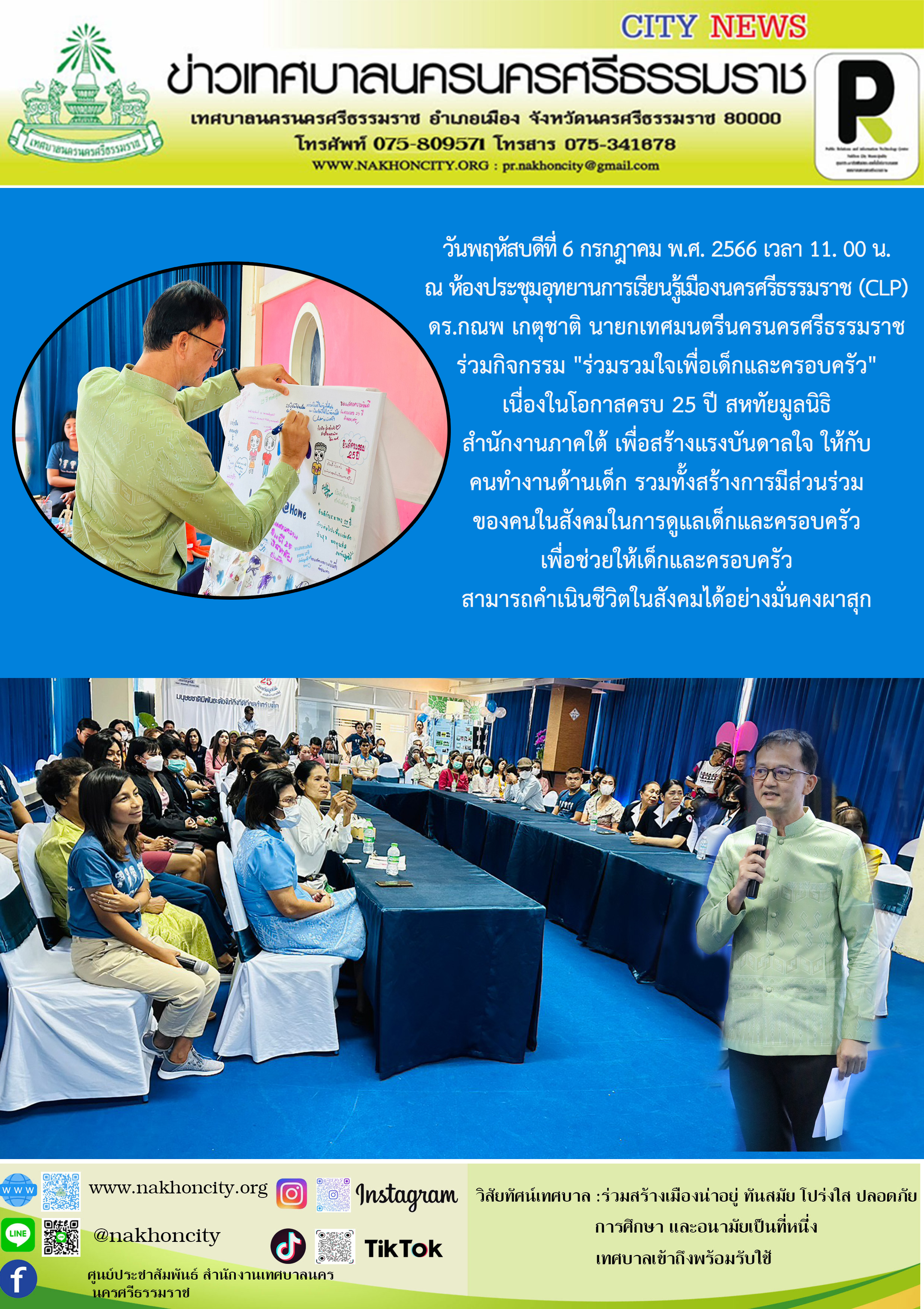 | ดร.กณพ เกตุชาติ นายกเทศมนตรีนครนครศรีธรรมราช ร่วมกิจกรรม "ร่วมรวมใจเพื่อเด็กและครอบครัว" เนื่องในโอกาสครบ 25 ปี สหทัยมูลนิธิ สำนักงานภาคใต้ |