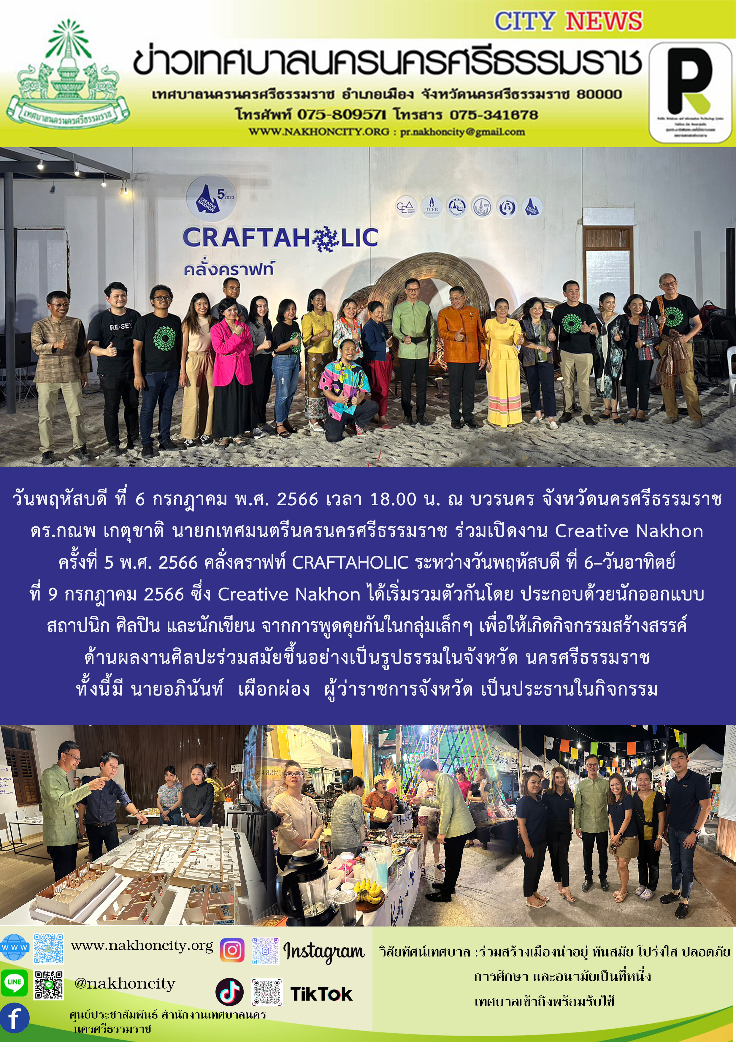 | ดร.กณพ เกตุชาติ นายกเทศมนตรีนครนครศรีธรรมราช ร่วมเปิดงาน Creative Nakhon ครั้งที่ 5 พ.ศ. 2566 คลั่งคราฟท์ CRAFTAHOLIC ระหว่างวันพฤหัสบดี ที่ 6–วันอาทิตย์ ที่ 9 กรกฎาคม 2566 |