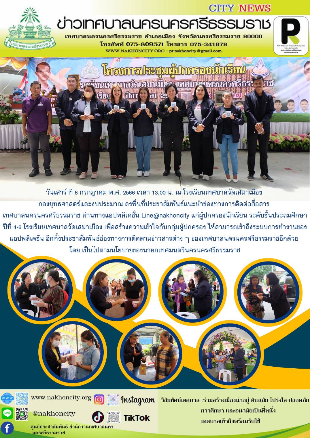 | กองยุทธศาสตร์และงบประมาณ ลงพื้นที่ประชาสัมพันธ์แนะนำช่องทางการติดต่อสื่อสาร เทศบาลนครนครศรีธรรมราช ผ่านทางแอปพลิเคชั่น Line@nakhoncity แก่ผู้ปกครองนักเรียนโรงเรียนเทศบาลวัดเสมาเมือง |