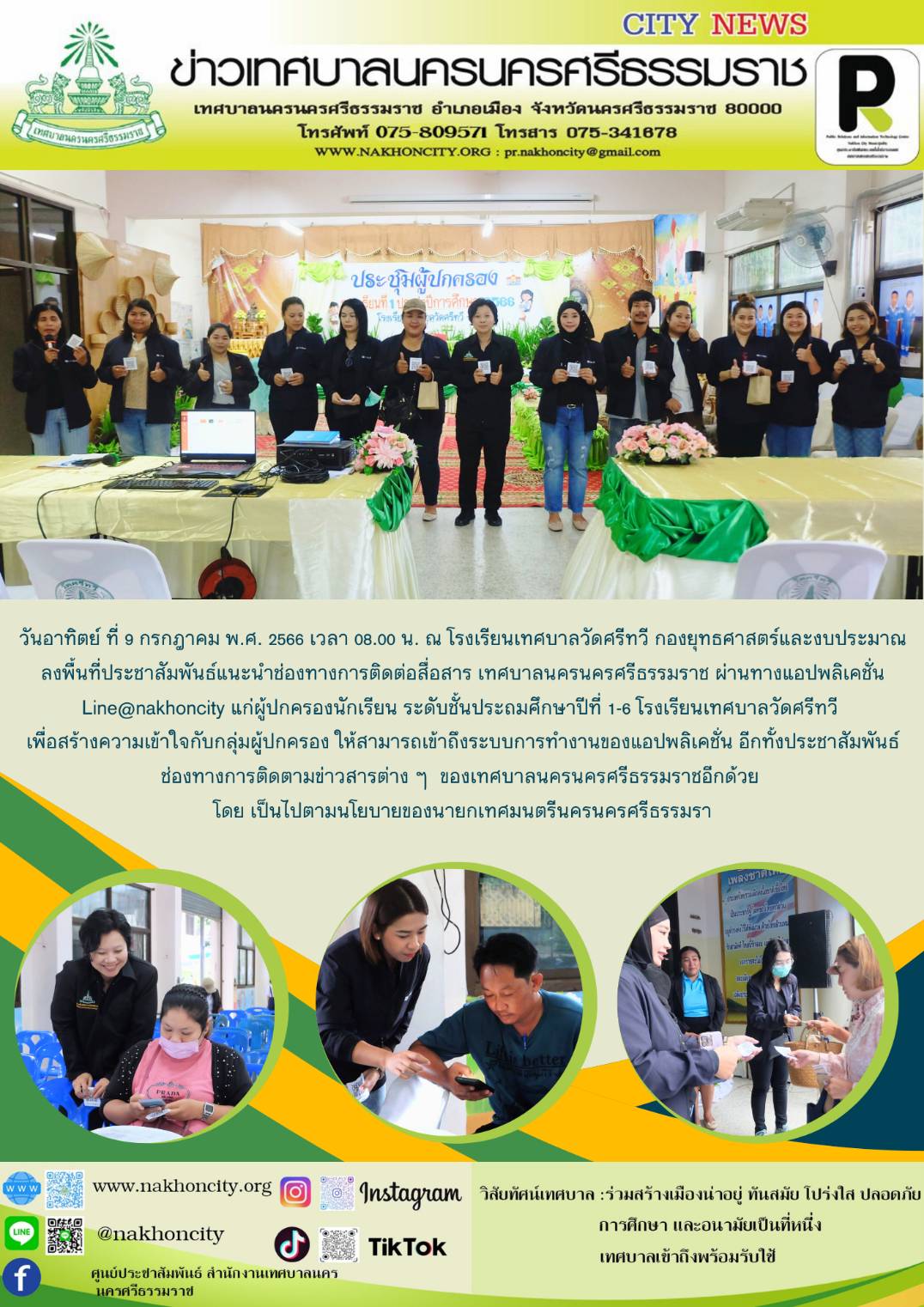 | วันอาทิตย์ ที่ 9 กรกฎาคม พ.ศ. 2566 เวลา 08.00 น. ณ โรงเรียนเทศบาลวัดศรีทวี กองยุทธศาสตร์และงบประมาณ ลงพื้นที่ประชาสัมพันธ์แนะนำช่องทางการติดต่อสื่อสาร เทศบาลนครนครศรีธรรมราช ผ่านทางแอปพลิเคชั่น Line@nakhoncity แก่ผู้ปกครองนักเรียน ระดับชั้นประถมศึกษาปีที่ 1-6 โรงเรียนเทศบาลวัดศรีทวี เพื่อสร้างความเข้าใจกับกลุ่มผู้ปกครอง ให้สามารถเข้าถึงระบบการทำงานของแอปพลิเคชั่น อีกทั้งประชาสัมพันธ์ช่องทางการติดตามข่าวสารต่าง ๆ  ของเทศบาลนครนครศรีธรรมราชอีกด้วย  |