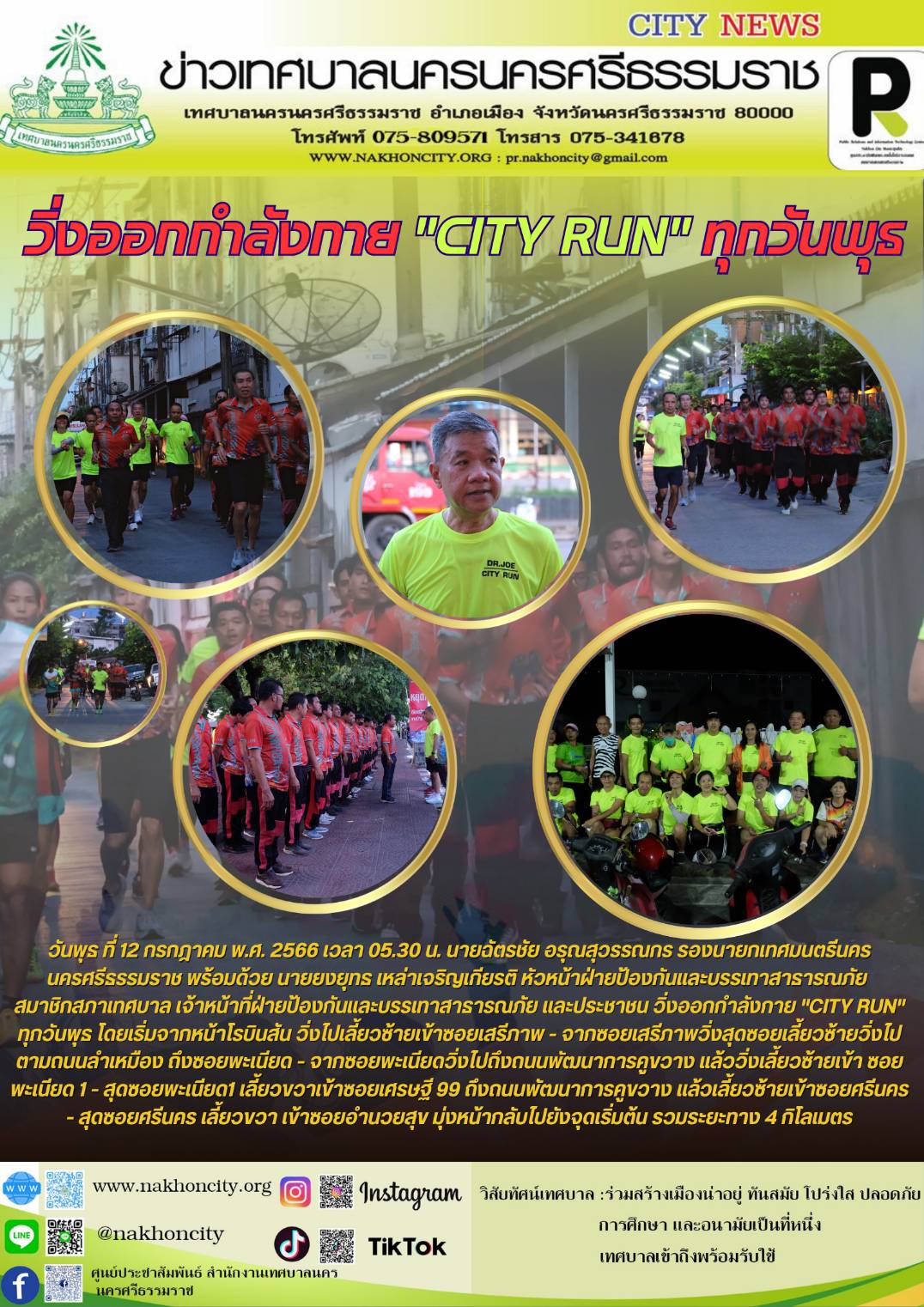| วันพุธ ที่ 12 กรกฎาคม พ.ศ. 2566 เวลา 05.30 น. นายฉัตรชัย อรุณสุวรรณกร รองนายกเทศมนตรีนครนครศรีธรรมราช พร้อมด้วย นายยงยุทธ เหล่าเจริญเกียรติ หัวหน้าฝ่ายป้องกันและบรรเทาสาธารณภัย สมาชิกสภาเทศบาล เจ้าหน้าที่ฝ่ายป้องกันและบรรเทาสาธารณภัย และประชาชน วิ่งออกกำลังกาย "CITY RUN" ทุกวันพุธ โดยเริ่มจากหน้าโรบินสัน วิ่งไปเลี้ยวซ้ายเข้าซอยเสรีภาพ - จากซอยเสรีภาพวิ่งสุดซอยเลี้ยวซ้ายวิ่งไปตามถนนลำเหมือง ถึงซอยพะเนียด - จากซอยพะเนียดวิ่งไปถึงถนนพัฒนาการคูขวาง แล้ววิ่งเลี้ยวซ้ายเข้า ซอยพะเนียด 1 - สุดซอยพะเนียด1 เลี้ยวขวาเข้าซอยเศรษฐี 99 ถึงถนนพัฒนาการคูขวาง แล้วเลี้ยวซ้ายเข้าซอยศรีนคร - สุดซอยศรีนคร เลี้ยวขวา เข้าซอยอำนวยสุข มุ่งหน้ากลับไปยังจุดเริ่มต้น รวมระยะทาง 4 กิโลเมตร ................ ภาพ//ข่าว//จันทร์จิรา |