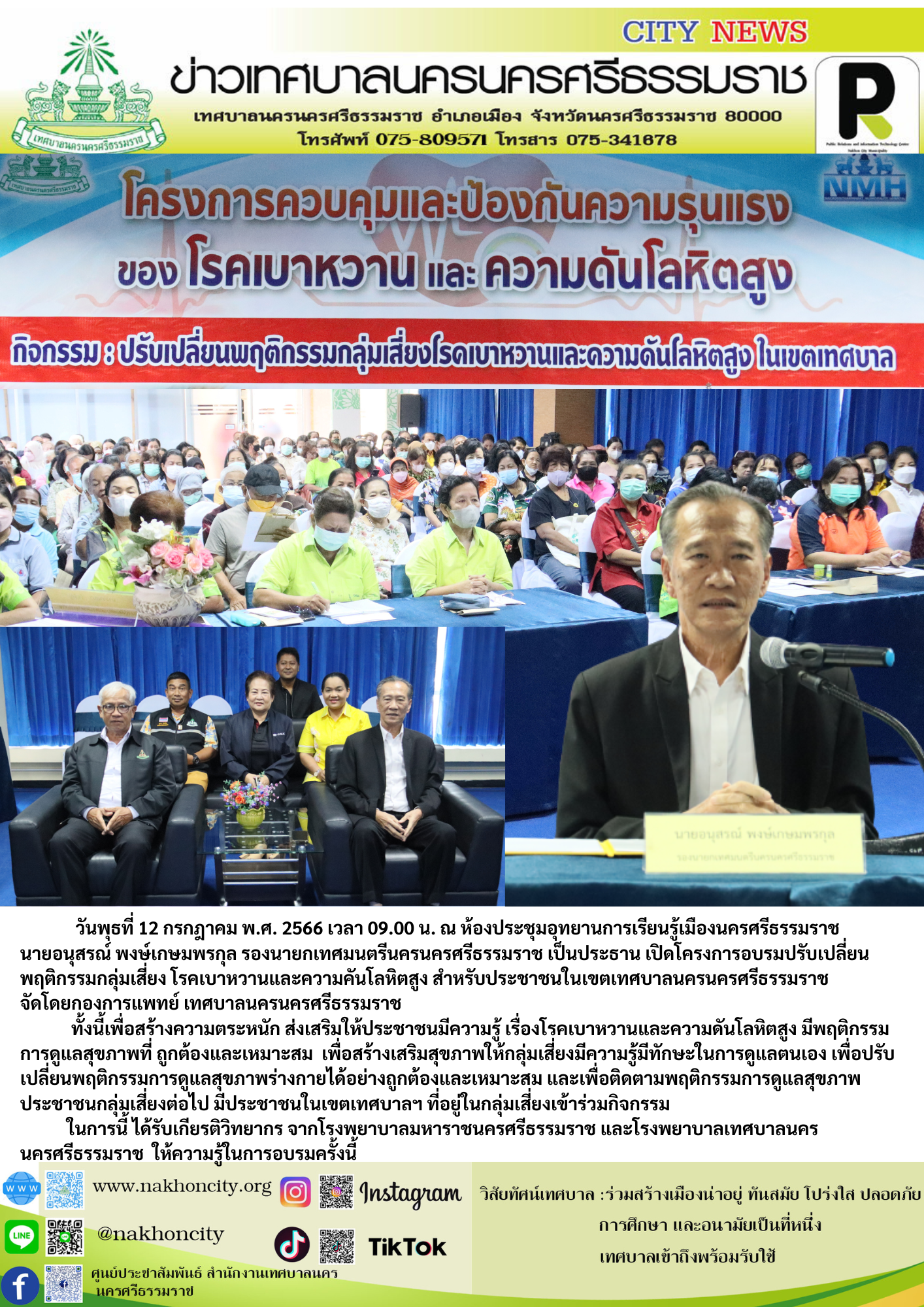 | วันพุธที่ 12 กรกฎาคม พ.ศ. 2566 เวลา 09.00 น. ณ ห้องประชุมอุทยานการเรียนรู้เมืองนครศรีธรรมราช นายอนุสรณ์ พงษ์เกษมพรกุล รองนายกเทศมนตรีนครนครศรีธรรมราช เป็นประธาน เปิดโครงการอบรมปรับเปลี่ยนพฤติกรรมกลุ่มเสี่ยง โรคเบาหวานและความคันโลหิตสูง สำหรับประชาชนในเขตเทศบาลนครนครศรีธรรมราช จัดโดยกองการแพทย์ เทศบาลนครนครศรีธรรมราช ทั้งนี้เพื่อสร้างความตระหนัก ส่งเสริมให้ประชาชนมีความรู้ เรื่องโรคเบาหวานและความดันโลหิตสูง มีพฤติกรรมการดูแลสุขภาพที่ ถูกต้องและเหมาะสม เพื่อสร้างเสริมสุขภาพให้กลุ่มเสี่ยงมีความรู้มีทักษะในการดูแลตนเอง เพื่อปรับเปลี่ยนพฤติกรรมการดูแลสุขภาพร่างกายได้อย่างถูกต้องและเหมาะสม และเพื่อติดตามพฤติกรรมการดูแลสุขภาพประชาชนกลุ่มเสี่ยงต่อไป มีประชาชนในเขตเทศบาลฯ ที่อยู่ในกลุ่มเสี่ยงเข้าร่วมกิจกรรม ในการนี้ ได้รับเกียรติวิทยากร จากโรงพยาบาลมหาราชนครศรีธรรมราช และโรงพยาบาลเทศบาลนครนครศรีธรรมราช ให้ความรู้ในการอบรมครั้งนี้ |