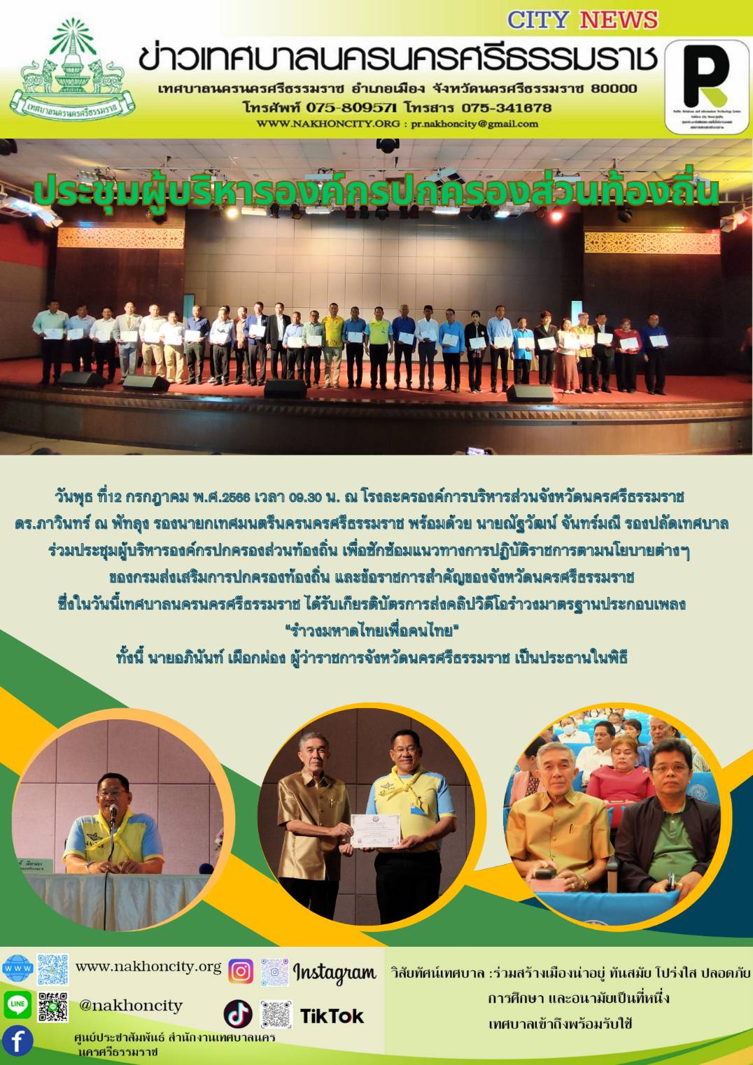 | วันพุธ ที่12 กรกฎาคม พ.ศ.2566 เวลา 09.30 น. ณ โรงละครองค์การบริหารส่วนจังหวัดนครศรีธรรมราช ดร.ภาวินทร์ ณ พัทลุง รองนายกเทศมนตรีนครนครศรีธรรมราช พร้อมด้วย นายณัฐวัฒน์ จันทร์มณี รองปลัดเทศบาล ร่วมประชุมผู้บริหารองค์กรปกครองส่วนท้องถิ่น เพื่อซักซ้อมแนวทางการปฏิบัติราชการตามนโยบายต่างๆ ของกรมส่งเสริมการปกครองท้องถิ่น และข้อราชการสำคัญของจังหวัดนครศรีธรรมราช โดยเทศบาลนครนครศรีธรรมราช ได้รับเกียรติบัตรการส่งคลิปวิดีโอรำวงมาตรฐานประกอบเพลง “รำวงมหาดไทยเพื่อคนไทย” ทั้งนี้ นายอภินันท์ เผือกผ่อง ผู้ว่าราชการจังหวัดนครศรีธรรมราช เป็นประธานในพิธี ..............