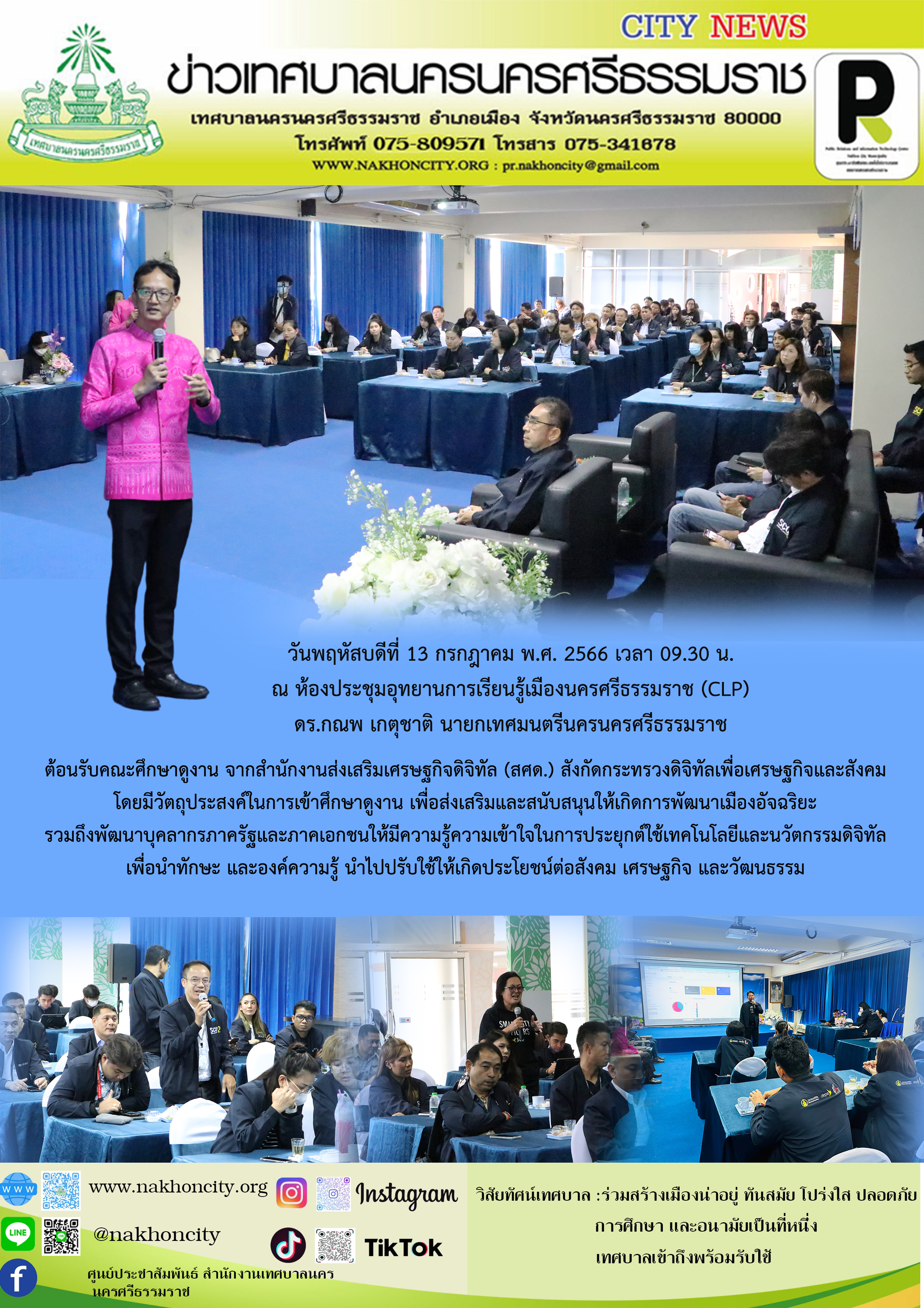 | ดร.กณพ เกตุชาติ นายกเทศมนตรีนครนครศรีธรรมราช ต้อนรับคณะศึกษาดูงาน จากสำนักงานส่งเสริมเศรษฐกิจดิจิทัล (สศด.) สังกัดกระทรวงดิจิทัลเพื่อเศรษฐกิจและสังคม |