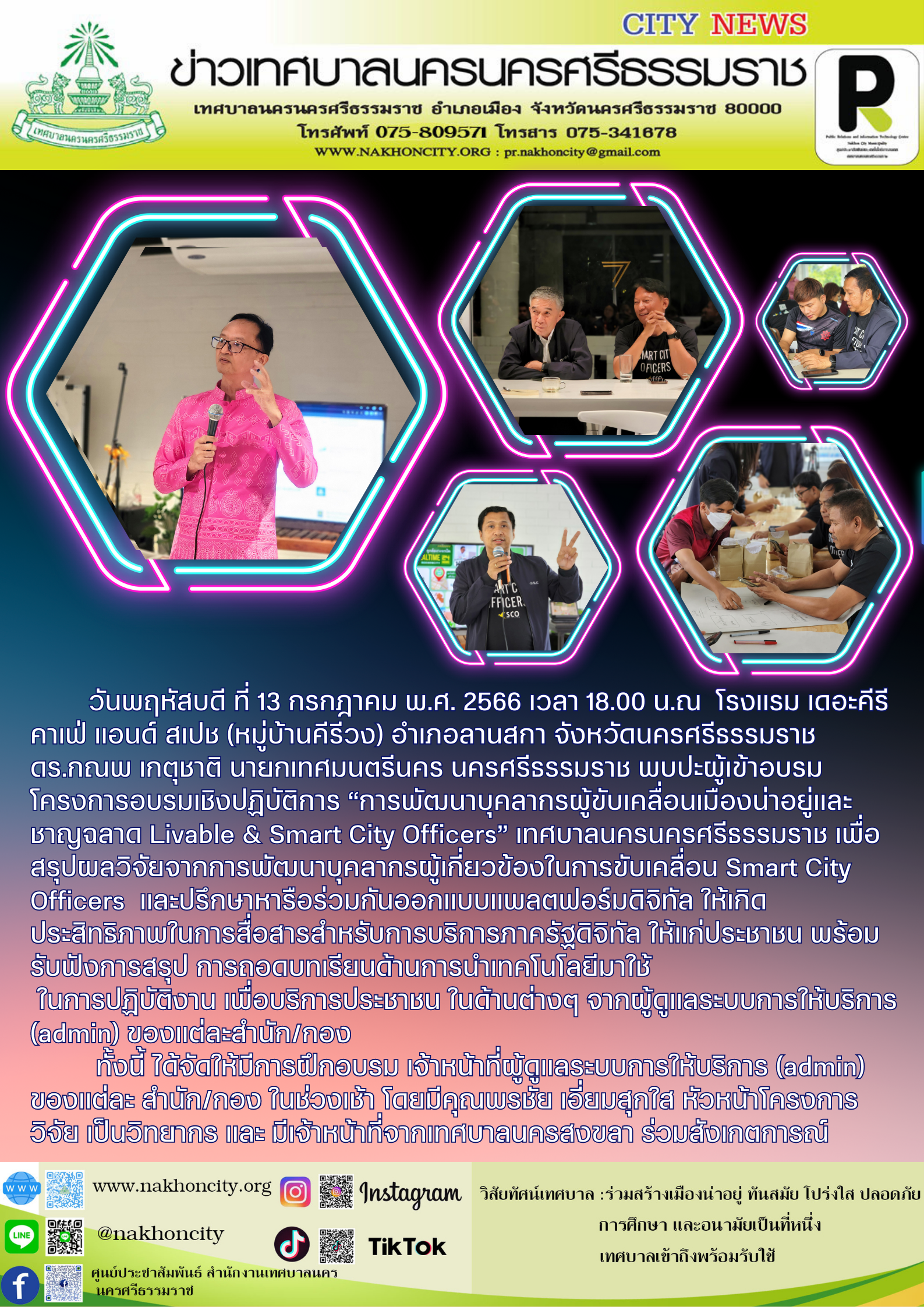 | วันพฤหัสบดี ที่ 13 กรกฎาคม พ.ศ. 2566 เวลา 18.00 น. ณ โรงแรม เดอะคีรี คาเฟ่ แอนด์ สเปช (หมู่บ้านคีรีวง) อำเภอลานสกา จังหวัดนครศรีธรรมราช ดร.กณพ เกตุชาติ นายกเทศมนตรีนคร นครศรีธรรมราช พบปะผู้เข้าอบรม โครงการอบรมเชิงปฏิบัติการ “การพัฒนาบุคลากรผู้ขับเคลื่อนเมืองน่าอยู่และชาญฉลาด Livable & Smart City Officers” เทศบาลนครนครศรีธรรมราช ทั้งนี้ เพื่อสรุปผลวิจัยจากการพัฒนาบุคลากรผู้เกี่ยวข้องในการขับเคลื่อน Smart City Officers และปรึกษาหารือร่วมกันออกแบบแพลตฟอร์มดิจิทัล ให้เกิดประสิทธิภาพในการสื่อสารสำหรับการบริการภาครัฐดิจิทัล ให้แก่ประชาชน ในด้านต่างๆ พร้อมรับฟังการสรุป การถอดบทเรียนด้านการนำเทคโนโลยีมาใช้ ในการปฏิบัติงาน เพื่อบริการประชาชน ในด้านต่างๆ จากผู้ดูแลระบบการให้บริการ (admin) ของแต่ละสำนัก/กอง ทั้งนี้ ได้จัดให้มีการฝึกอบรม เจ้าหน้าที่ผู้ดูแลระบบการให้บริการ (admin) ของแต่ละ สำนัก/กอง ในช่วงเช้า โดยมีคุณพรชัย เอี่ยมสุกใส หัวหน้าโครงการวิจัย เป็นวิทยากร และ มีเจ้าหน้าที่จากเทศบาลนครสงขลา ร่วมสังเกตการณ์
