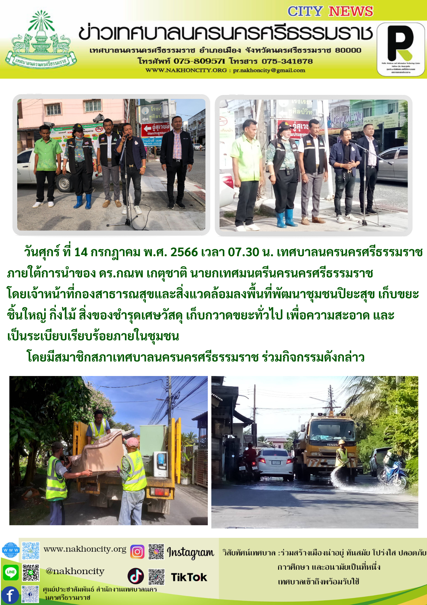 | วันศุกร์ ที่ 14 กรกฎาคม พ.ศ. 2566 เวลา 07.30 น. เทศบาลนครนครศรีธรรมราช ภายใต้การนำของ ดร.กณพ เกตุชาติ นายกเทศมนตรีนครนครศรีธรรมราช โดยเจ้าหน้าที่กองสาธารณสุขและสิ่งแวดล้อมลงพื้นที่พัฒนาชุมชนปิยะสุข เก็บขยะชิ้นใหญ่ กิ่งไม้ สิ่งของชำรุดเศษวัสดุ เก็บกวาดขยะทั่วไป เพื่อความสะอาด และเป็นระเบียบเรียบร้อยภายในชุมชน โดยมีสมาชิกสภาเทศบาลนครนครศรีธรรมราช ร่วมกิจกรรมดังกล่าว