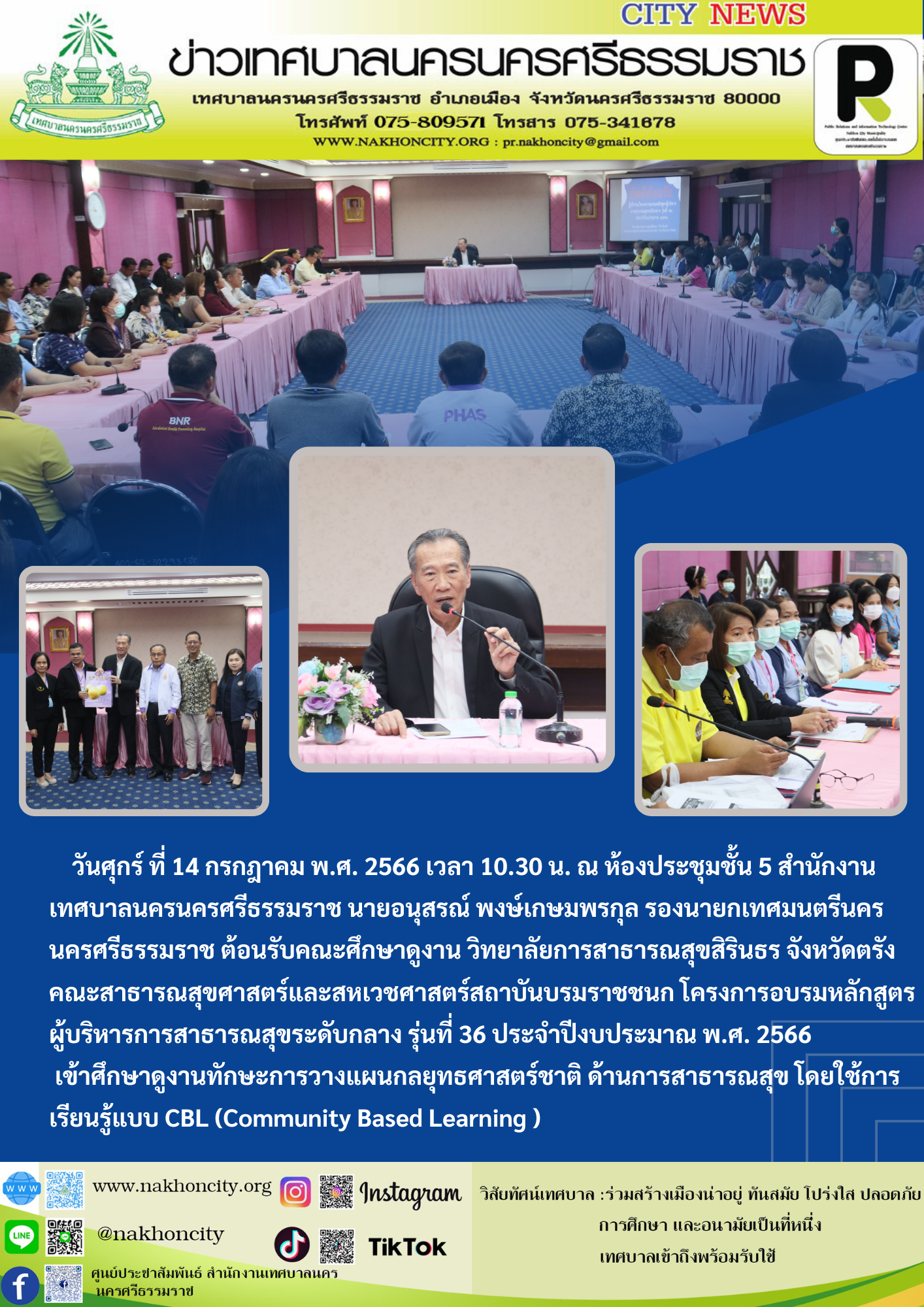 | วันศุกร์ ที่ 14 กรกฎาคม พ.ศ. 2566 เวลา 10.30 น. ณ ห้องประชุมชั้น 5 สำนักงานเทศบาลนครนครศรีธรรมราช นายอนุสรณ์ พงษ์เกษมพรกุล รองนายกเทศมนตรีนครนครศรีธรรมราช ต้อนรับคณะศึกษาดูงาน วิทยาลัยการสาธารณสุขสิรินธร จังหวัดตรัง คณะสาธารณสุขศาสตร์และสหเวชศาสตร์สถาบันบรมราชชนก โครงการอบรมหลักสูตร ผู้บริหารการสาธารณสุขระดับกลาง รุ่นที่ 36 ประจำปีงบประมาณ พ.ศ. 2566 เข้าศึกษาดูงานทักษะการวางแผนกลยุทธศาสตร์ชาติ ด้านการสาธารณสุข โดยใช้การเรียนรู้แบบ CBL (Community Based Learning )