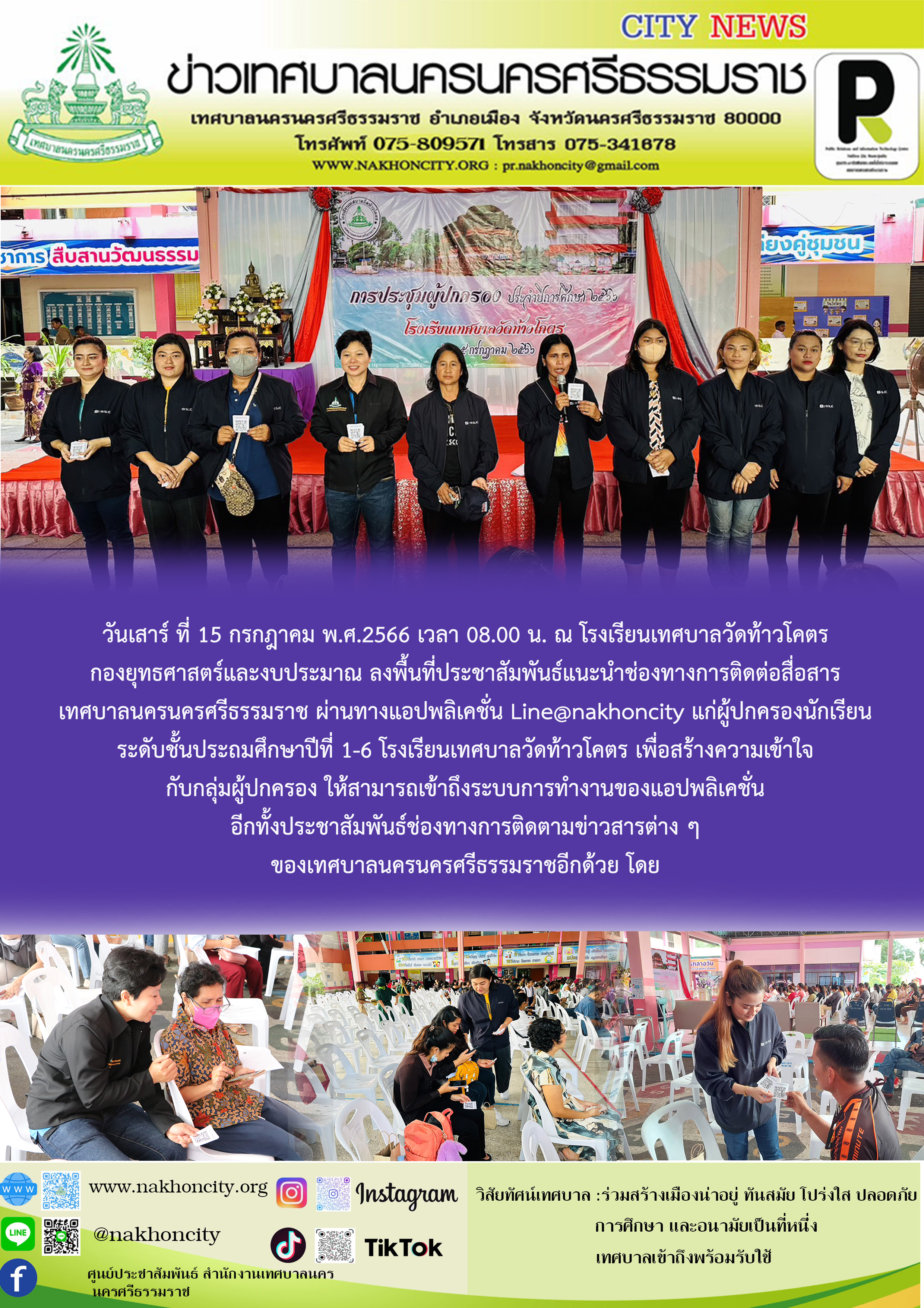 | กองยุทธศาสตร์และงบประมาณ ลงพื้นที่ประชาสัมพันธ์แนะนำช่องทางการติดต่อสื่อสาร เทศบาลนครนครศรีธรรมราช ผ่านทางแอปพลิเคชั่น Line@nakhoncity แก่ผู้ปกครองนักเรียน ระดับชั้นประถมศึกษาปีที่ 1-6 โรงเรียนเทศบาลวัดท้าวโคตร |
