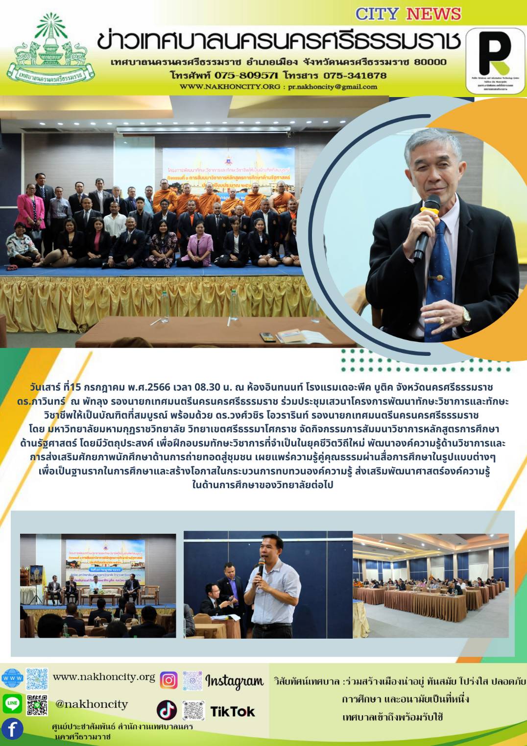 | ดร.ภาวินทร์ ณ พัทลุง รองนายกเทศมนตรีนครนครศรีธรรมราช ร่วมประชุมเสวนาโครงการพัฒนาทักษะวิชาการและทักษะวิชาชีพให้เป็นบัณฑิตที่สมบูรณ์ พร้อมด้วย ดร.วงศ์วชิร โอวรารินท์ รองนายกเทศมนตรีนครนครศรีธรรมราช |
