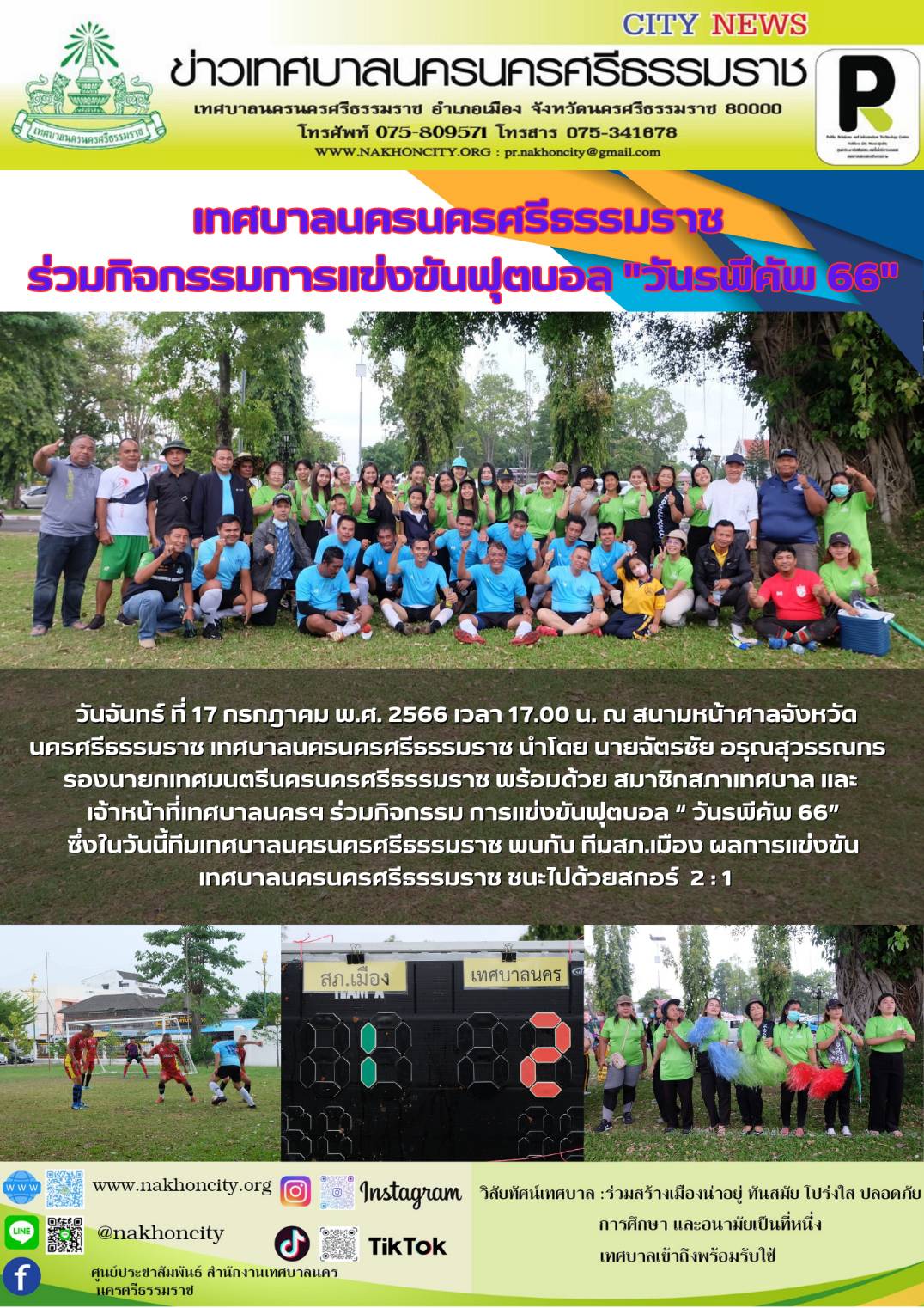 | วันจันทร์ ที่ 17 กรกฎาคม พ.ศ. 2566 เวลา 17.00 น. ณ สนามหน้าศาลจังหวัดนครศรีธรรมราช เทศบาลนครนครศรีธรรมราช นำโดย นายฉัตรชัย อรุณสุวรรณกร  รองนายกเทศมนตรีนครนครศรีธรรมราช พร้อมด้วย สมาชิกสภาเทศบาล และเจ้าหน้าที่เทศบาลนครฯ ร่วมกิจกรรม การแข่งขันฟุตบอล “ วันรพีคัพ 66”  |