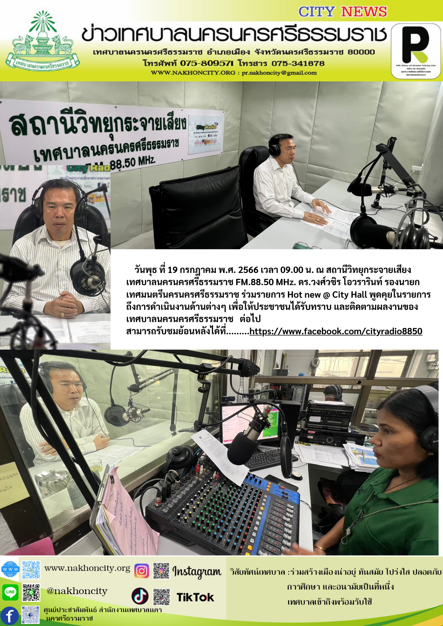 | วันพุธ ที่ 19 กรกฎาคม พ.ศ. 2566 เวลา 09.00 น. ณ สถานีวิทยุกระจายเสียง เทศบาลนครนครศรีธรรมราช FM.88.50 MHZ. ดร.วงศ์วชิร โอวรารินท์ รองนายกเทศมนตรีนครนครศรีธรรมราช ร่วมรายการ HOT NEW @ CITY HALL สถานีวิทยุกระจายเสียง เทศบาลนครนครศรีธรรมราช FM.88.50 MHZ. |