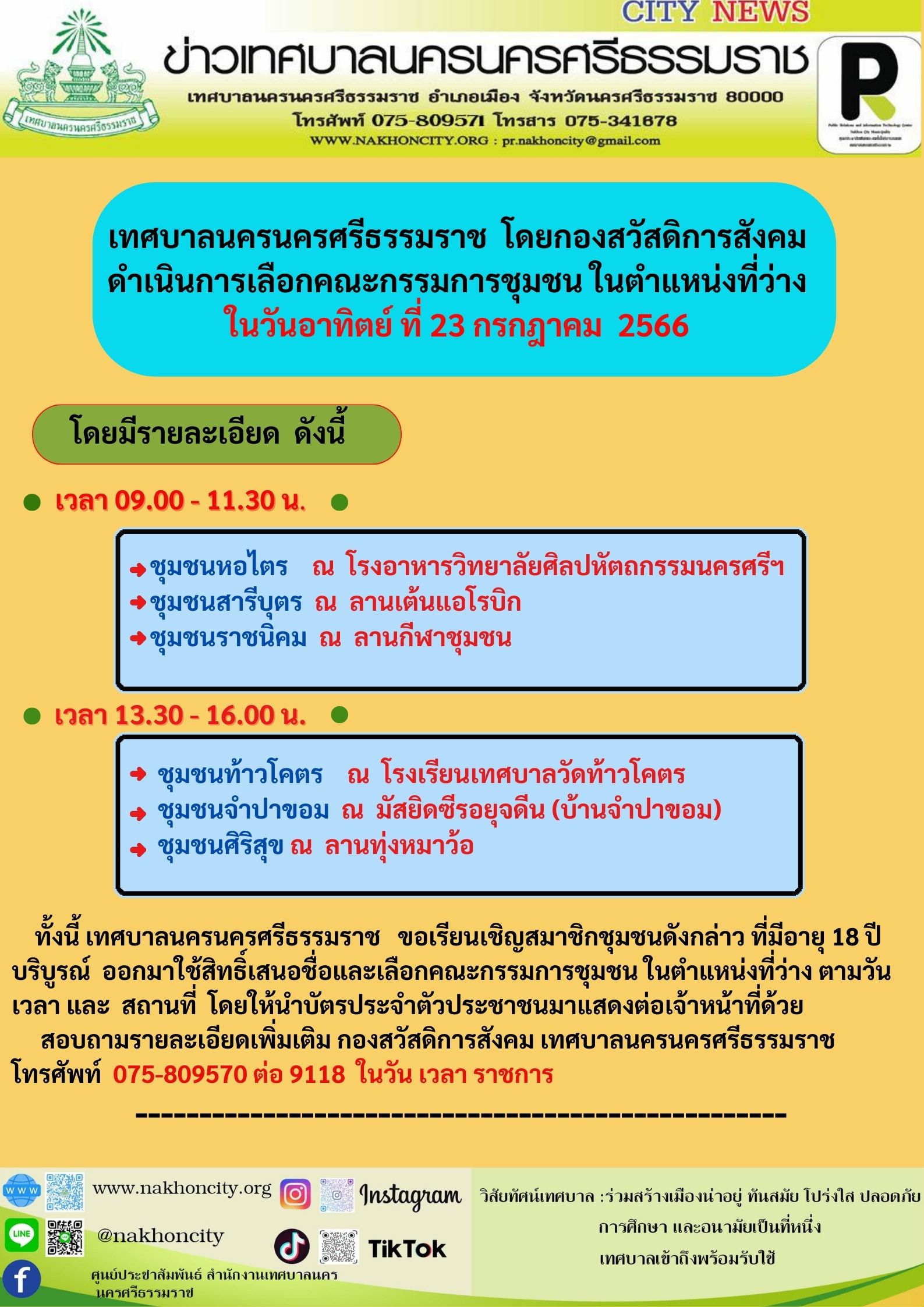 | เทศบาลนครนครศรีธรรมราช โดยกองสวัสดิการสังคม ดำเนินการเลือกคณะกรรมการชุมชน ในตำแหน่งที่ว่าง ในวันอาทิตย์ ที่ 23 กรกฎาคม 2566 |