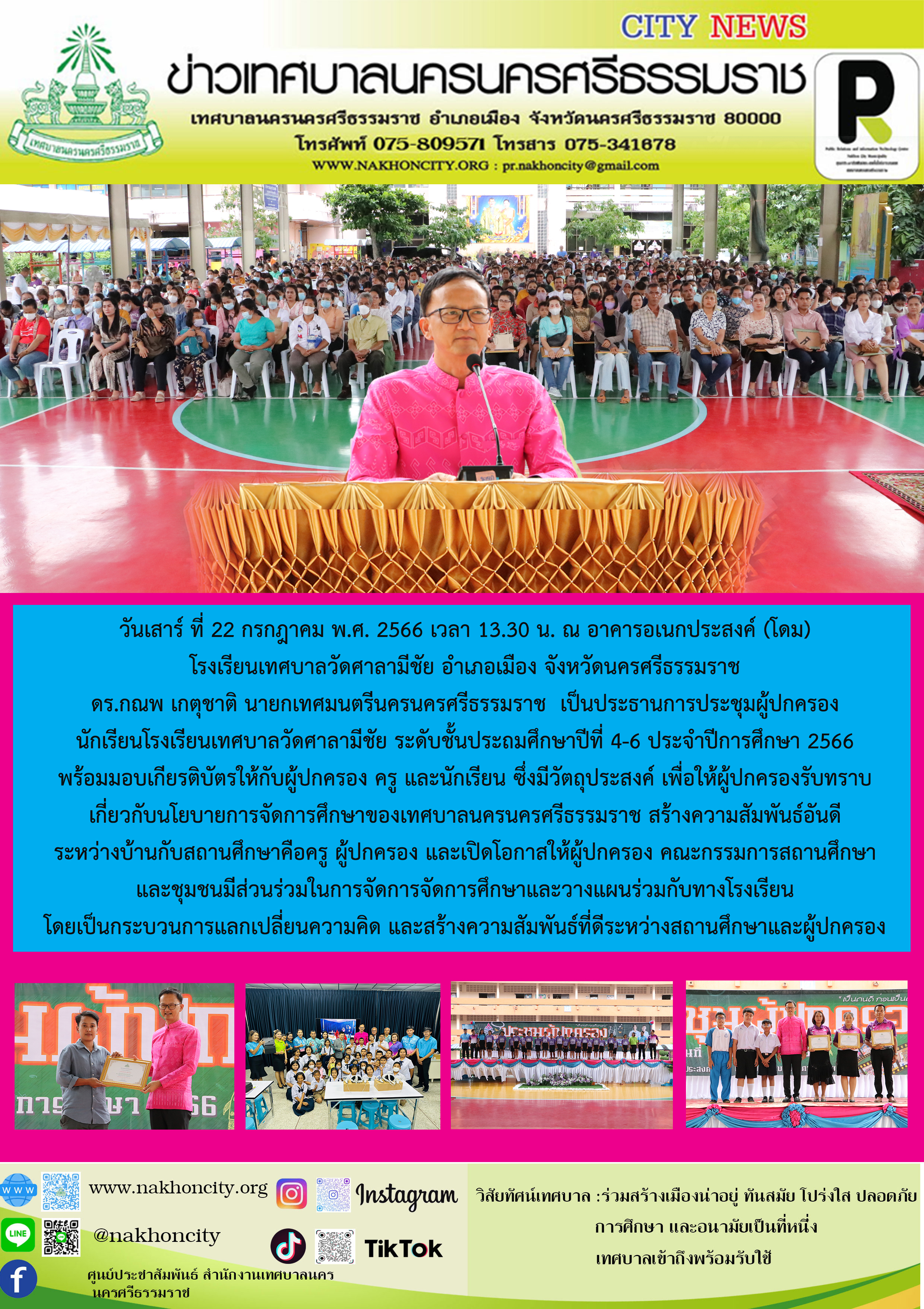 | วันเสาร์ ที่ 22 กรกฎาคม พ.ศ. 2566 เวลา 13.30 น. ณ อาคารอเนกประสงค์ (โดม) โรงเรียนเทศบาลวัดศาลามีชัย ดร.กณพ เกตุชาติ นายกเทศมนตรีนครนครศรีธรรมราช เป็นประธาน เปิดการประชุมผู้ปกครองนักเรียนโรงเรียนเทศบาลวัดศาลามีชัย ระดับชั้นประถมศึกษาปีที่ 4-6 ประจำปีการศึกษา 2566 พร้อมมอบเกียรติบัตรให้กับผู้ปกครอง ครู และนักเรียน ซึ่งมีวัตถุประสงค์ เพื่อให้ผู้ปกครองรับทราบเกี่ยวกับนโยบายการจัดการศึกษาของเทศบาลนครนครศรีธรรมราช สร้างความสัมพันธ์อันดีระหว่างบ้านกับสถานศึกษาคือครู และผู้ปกครอง และเปิดโอกาสให้ผู้ปกครอง คณะกรรมการสถานศึกษาและชุมชนมีส่วนร่วมในการจัดการจัดการศึกษาและวางแผนร่วมกับทางโรงเรียน โดยเป็นกระบวนการแลกเปลี่ยนความคิด และสร้างความสัมพันธ์ที่ดีระหว่างสถานศึกษาและผู้ปกครอง