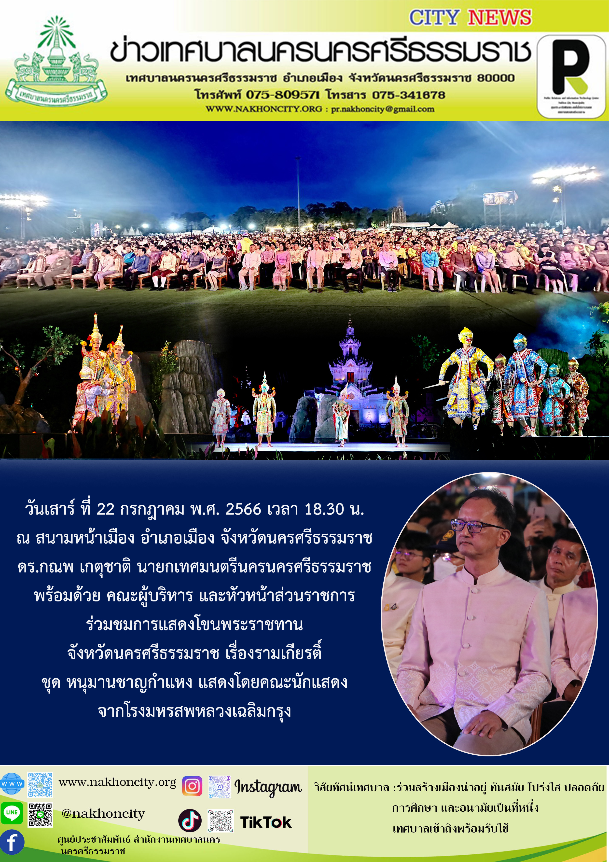 | ดร.กณพ เกตุชาติ นายกเทศมนตรีนครนครศรีธรรมราช พร้อมด้วย คณะผู้บริหาร และหัวหน้าส่วนราชการ ร่วมชมการแสดงโขนพระราชทาน จังหวัดนครศรีธรรมราช เรื่องรามเกียรติ์ ชุด หนุมานชาญกำแหง |