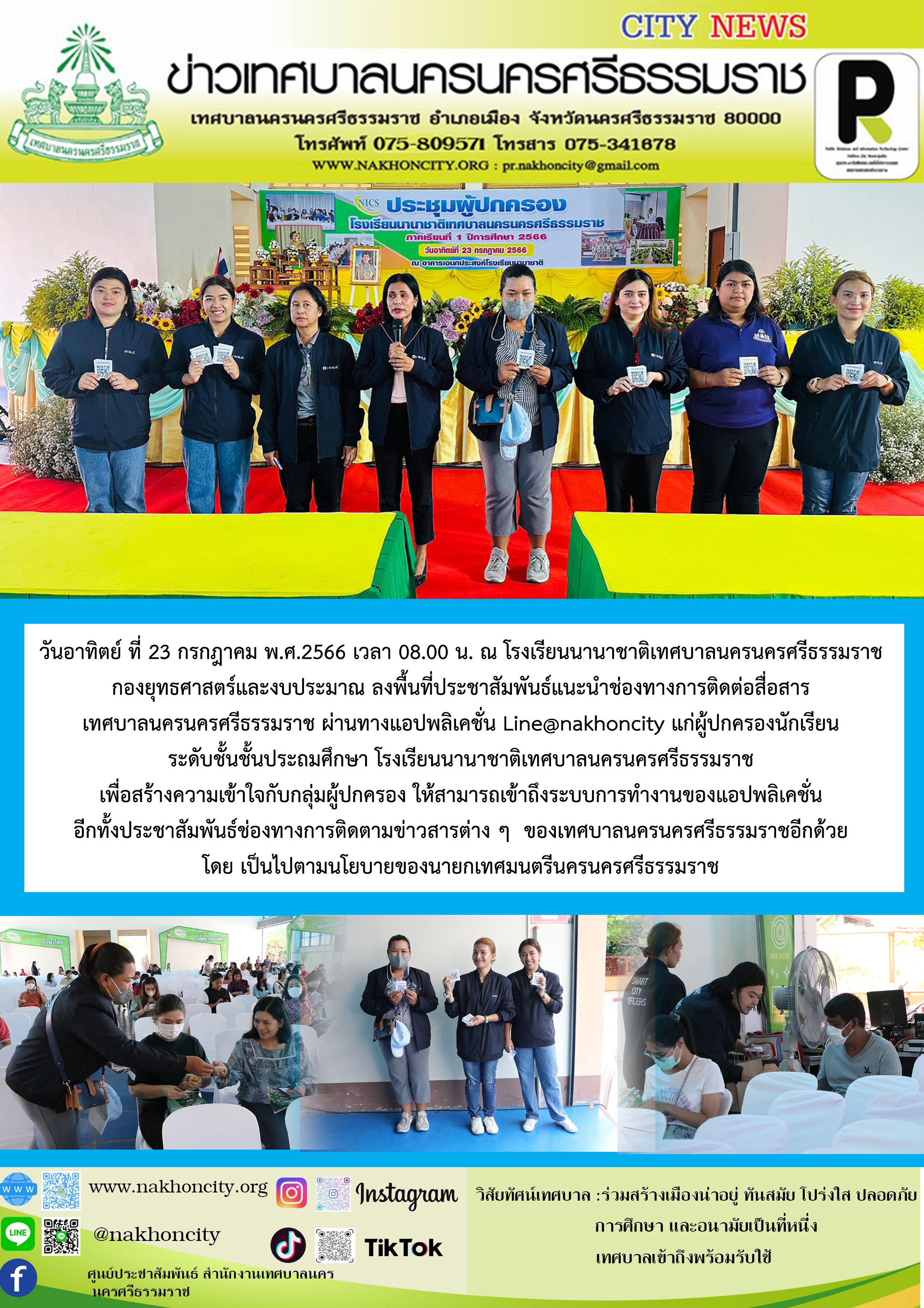 | กองยุทธศาสตร์และงบประมาณ ลงพื้นที่ประชาสัมพันธ์แนะนำช่องทางการติดต่อสื่อสาร เทศบาลนครนครศรีธรรมราช ผ่านทางแอปพลิเคชั่น Line@nakhoncity แก่ผู้ปกครองนักเรียน ระดับชั้นชั้นประถมศึกษา โรงเรียนนานาชาติเทศบาลนครนครศรีธรรมราช |