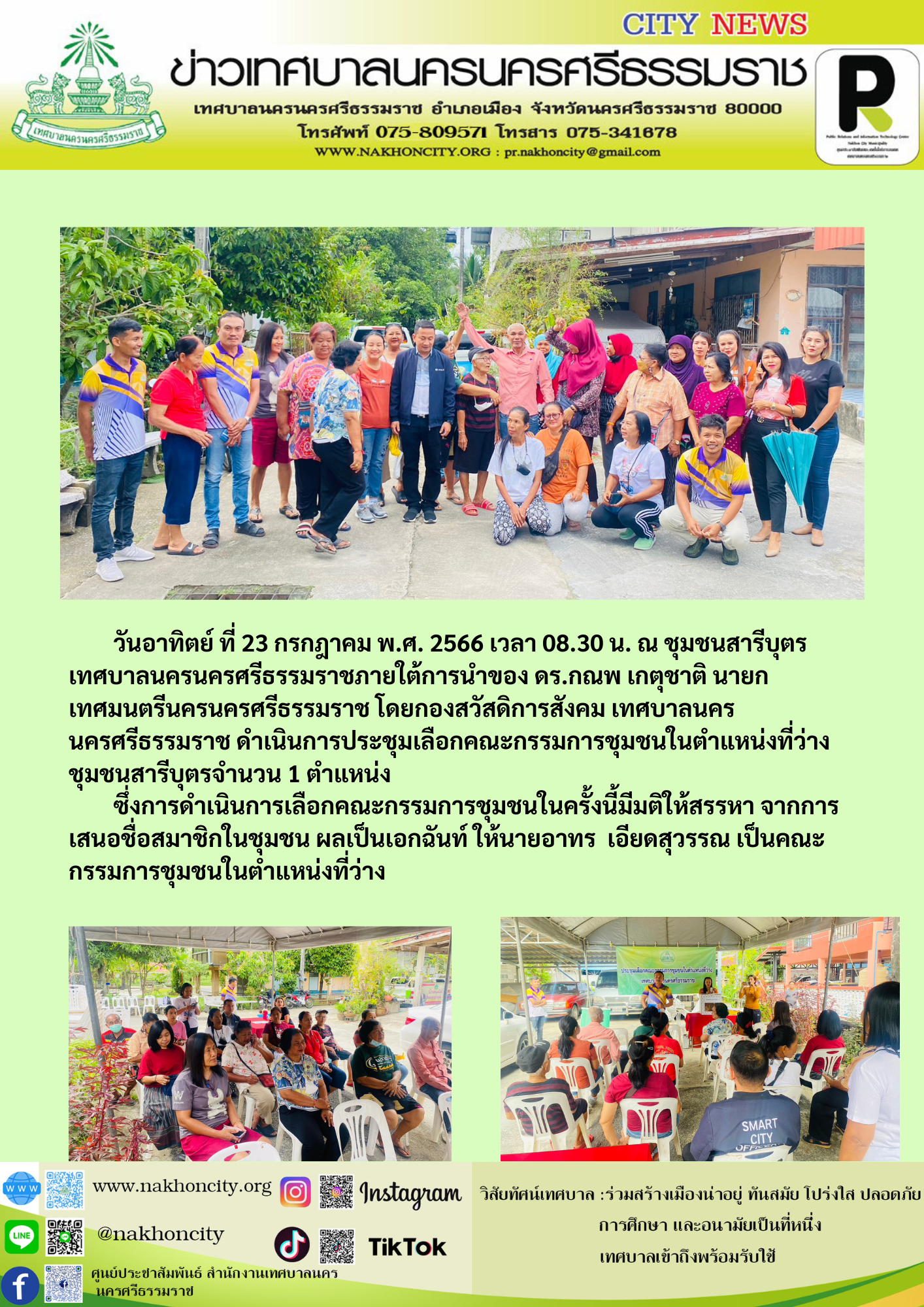 | วันอาทิตย์ ที่ 23 กรกฎาคม พ.ศ. 2566 เวลา 08.30 น. ณ ชุมชนสารีบุตร เทศบาลนครนครศรีธรรมราชภายใต้การนำของ ดร.กณพ เกตุชาติ นายกเทศมนตรีนครนครศรีธรรมราช โดยกองสวัสดิการสังคม เทศบาลนครนครศรีธรรมราช ดำเนินการประชุมเลือกคณะกรรมการชุมชนในตำแหน่งที่ว่าง ชุมชนสารีบุตรจำนวน 1 ตำแหน่ง ซึ่งการดำเนินการเลือกคณะกรรมการชุมชนในครั้งนี้มีมติให้สรรหา จากการเสนอชื่อสมาชิกในชุมชน ผลเป็นเอกฉันท์ ให้นายอาทร เอียดสุวรรณ เป็นคณะกรรมการชุมชนในตำแหน่งที่ว่าง |