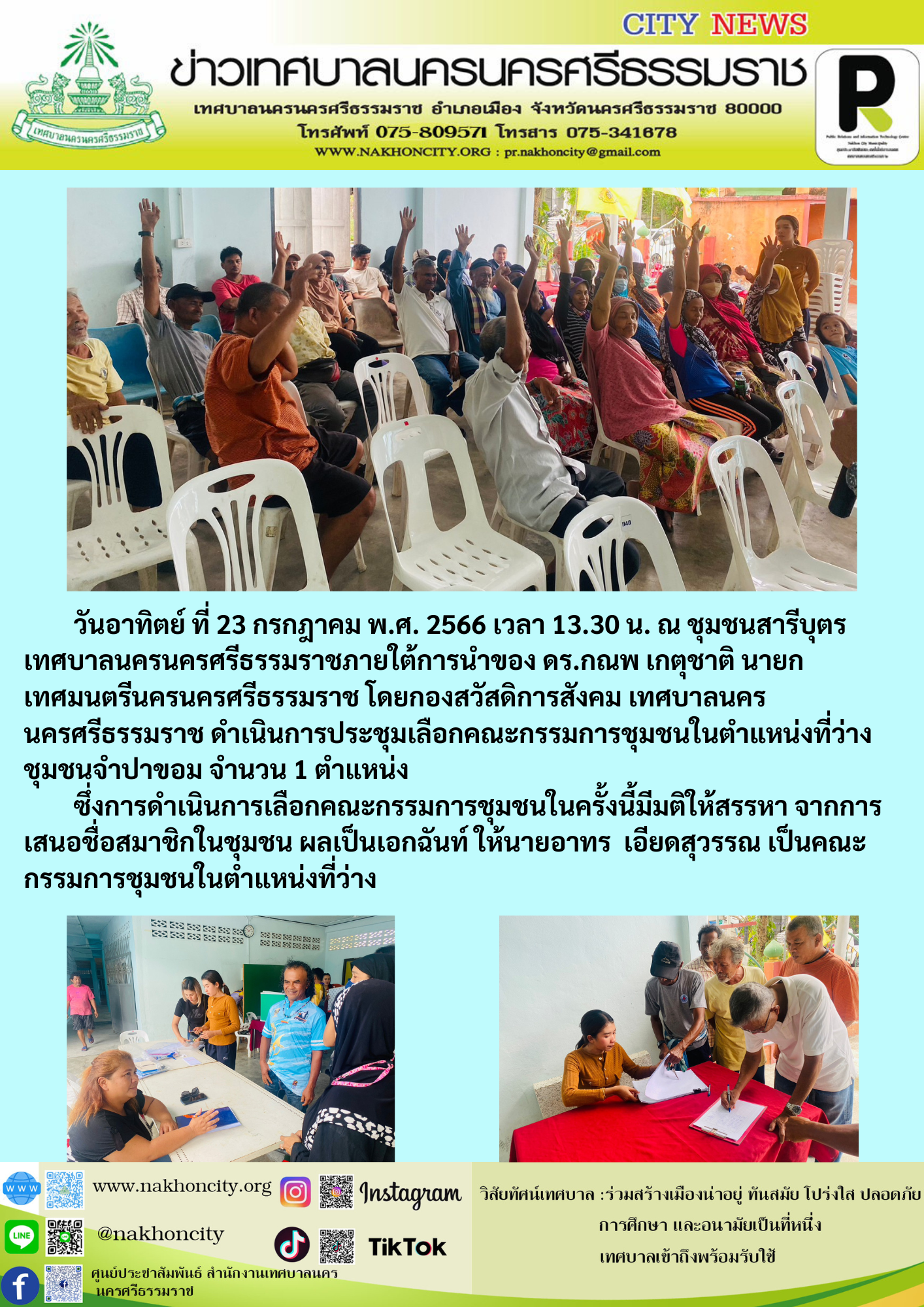 | วันอาทิตย์ ที่ 23 กรกฎาคม พ.ศ. 2566 เวลา 13.30 น. ณ ชุมชนจำปาขอม เทศบาลนครนครศรีธรรมราชภายใต้การนำของ ดร.กณพ เกตุชาติ นายกเทศมนตรีนครนครศรีธรรมราช โดยกองสวัสดิการสังคม เทศบาลนครนครศรีธรรมราช ดำเนินการประชุมเลือกคณะกรรมการชุมชนในตำแหน่งที่ว่าง จำนวน 1 ตำแหน่ง ซึ่งการดำเนินการเลือกคณะกรรมการชุมชนในครั้งนี้มีมติให้สรรหา จากการเสนอชื่อสมาชิกในชุมชน และใช้วิธีเปิดเผย ( ยกมือ ) |