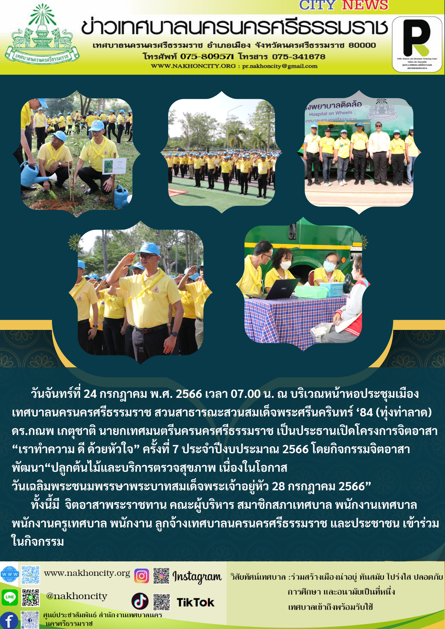| วันจันทร์ที่ 24 กรกฎาคม พ.ศ. 2566 เวลา 07.00 น. ณ บริเวณหน้าหอประชุมเมืองเทศบาลนครนครศรีธรรมราช สวนสาธารณะสวนสมเด็จพระศรีนครินทร์ ‘84 (ทุ่งท่าลาด)