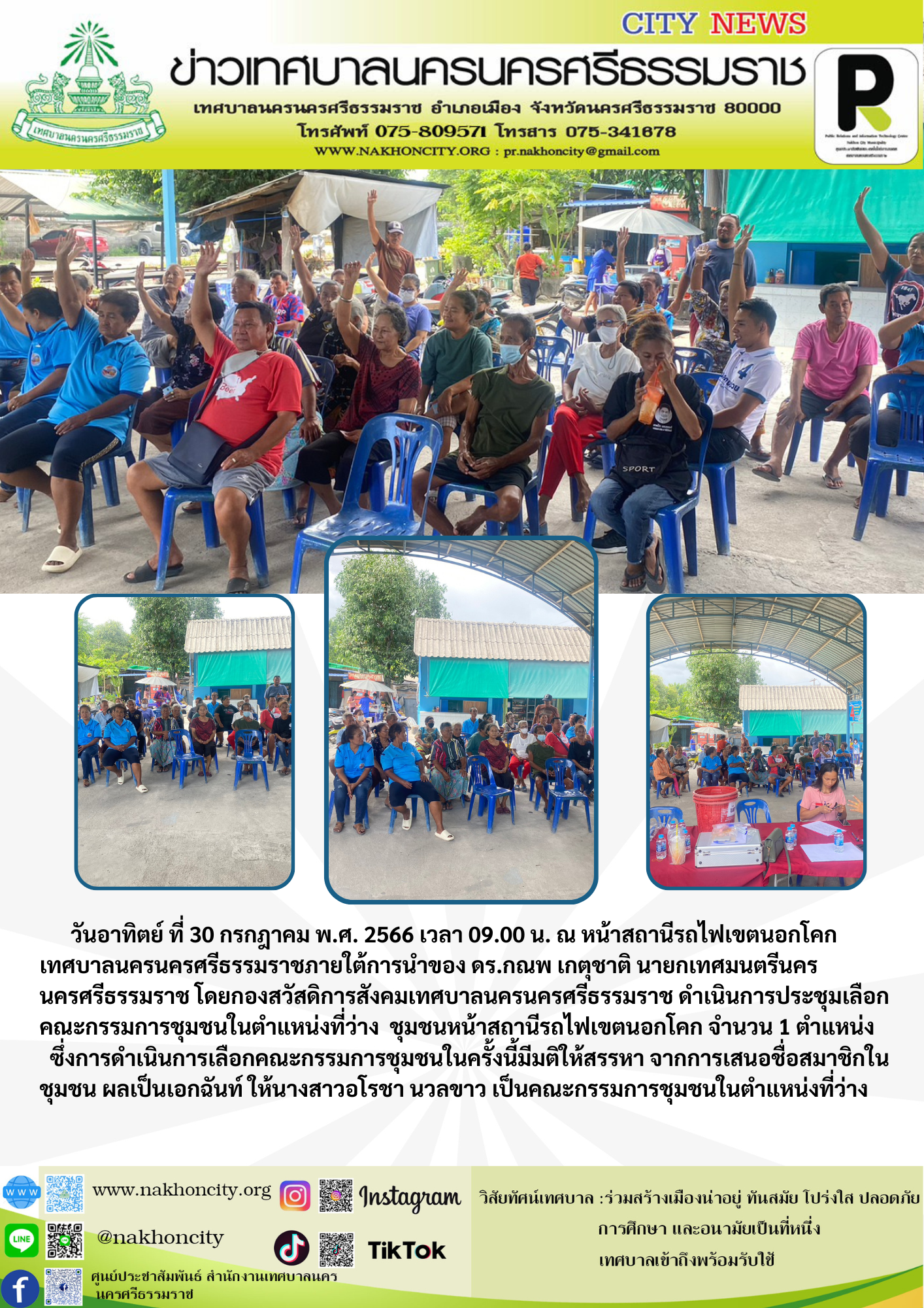 | วันอาทิตย์ ที่ 30 กรกฎาคม พ.ศ. 2566 เวลา 08.30 น. ณ หน้าสถานีรถไฟเขตนอกโคก เทศบาลนครนครศรีธรรมราชภายใต้การนำของ ดร.กณพ เกตุชาติ นายกเทศมนตรีนครนครศรีธรรมราช โดยกองสวัสดิการสังคมเทศบาลนครนครศรีธรรมราช ดำเนินการประชุมเลือกคณะกรรมการชุมชนในตำแหน่งที่ว่าง ชุมชนหน้าสถานีรถไฟเขตนอกโคก จำนวน 1 ตำแหน่ง ซึ่งการดำเนินการเลือกคณะกรรมการชุมชนในครั้งนี้มีมติให้สรรหา จากการเสนอชื่อสมาชิกในชุมชน ผลเป็นเอกฉันท์ ให้นางสาวอโรชา นวลขาว เป็นคณะกรรมการชุมชนในตำแหน่งที่ว่าง |