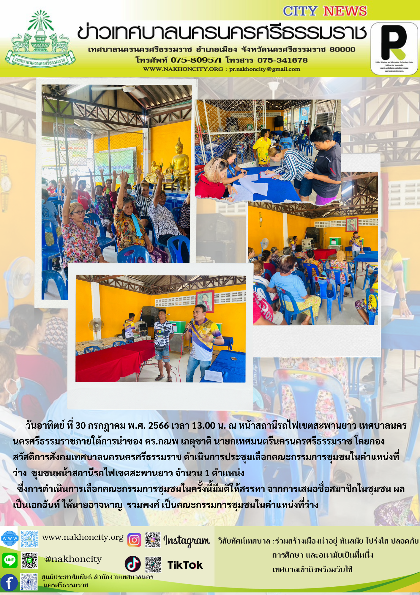 | วันอาทิตย์ ที่ 30 กรกฎาคม พ.ศ. 2566 เวลา 13.00 น. ณ หน้าสถานีรถไฟเขตสะพานยาว เทศบาลนครนครศรีธรรมราชภายใต้การนำของ ดร.กณพ เกตุชาติ นายกเทศมนตรีนครนครศรีธรรมราช โดยกองสวัสดิการสังคมเทศบาลนครนครศรีธรรมราช ดำเนินการประชุมเลือกคณะกรรมการชุมชนในตำแหน่งที่ว่าง ชุมชนหน้าสถานีรถไฟเขตสะพานยาว จำนวน 1 ตำแหน่ง ซึ่งการดำเนินการเลือกคณะกรรมการชุมชนในครั้งนี้มีมติให้สรรหา จากการเสนอชื่อสมาชิกในชุมชน ผลเป็นเอกฉันท์ ให้นายอาจหาญ รวมพงศ์ เป็นคณะกรรมการชุมชนในตำแหน่งที่ว่าง |