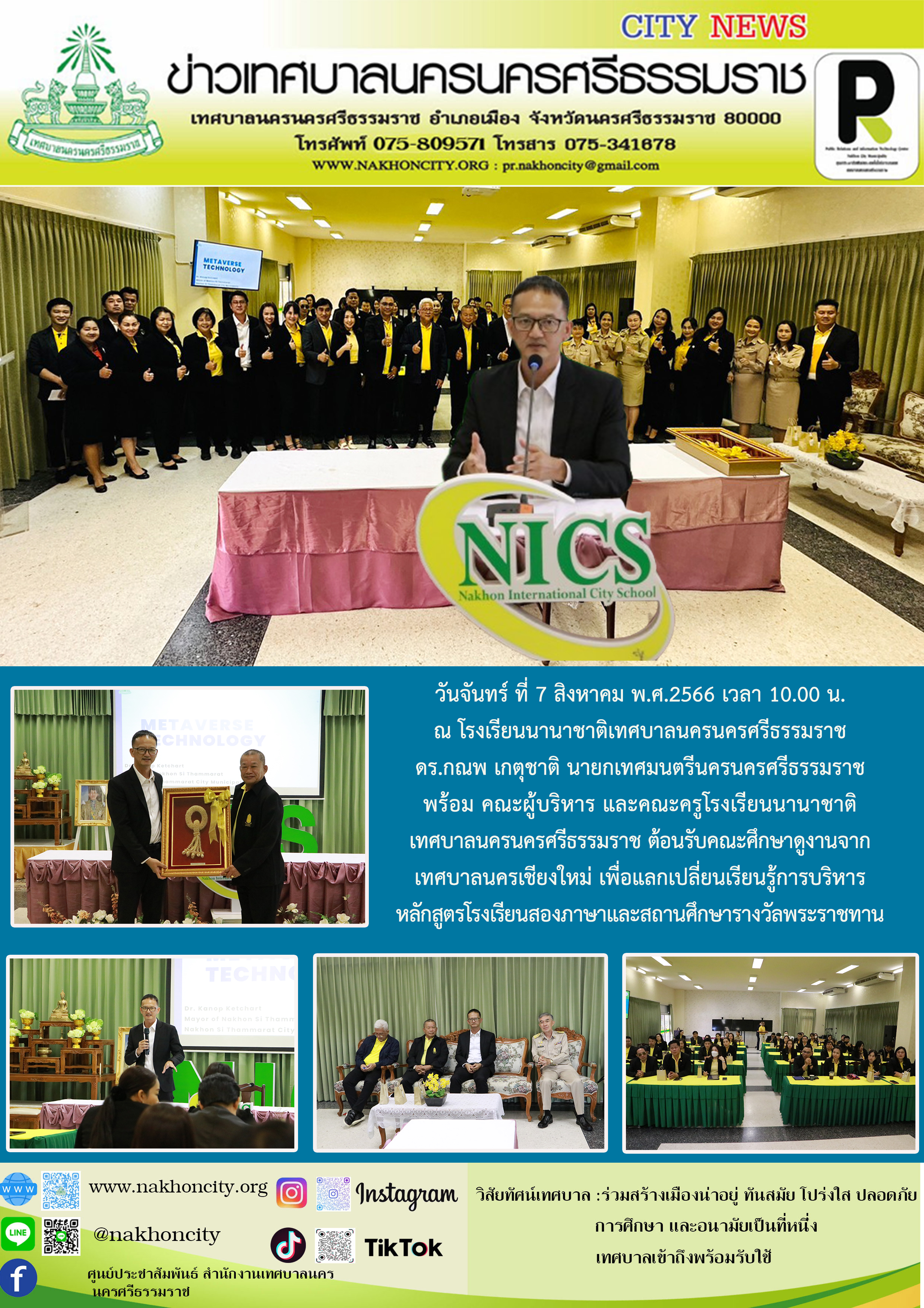 | ดร.กณพ เกตุชาติ นายกเทศมนตรีนครนครศรีธรรมราช พร้อม คณะผู้บริหาร และคณะครูโรงเรียนนานาชาติเทศบาลนครนครศรีธรรมราช ต้อนรับคณะศึกษาดูงานจาก เทศบาลนครเชียงใหม่ |
