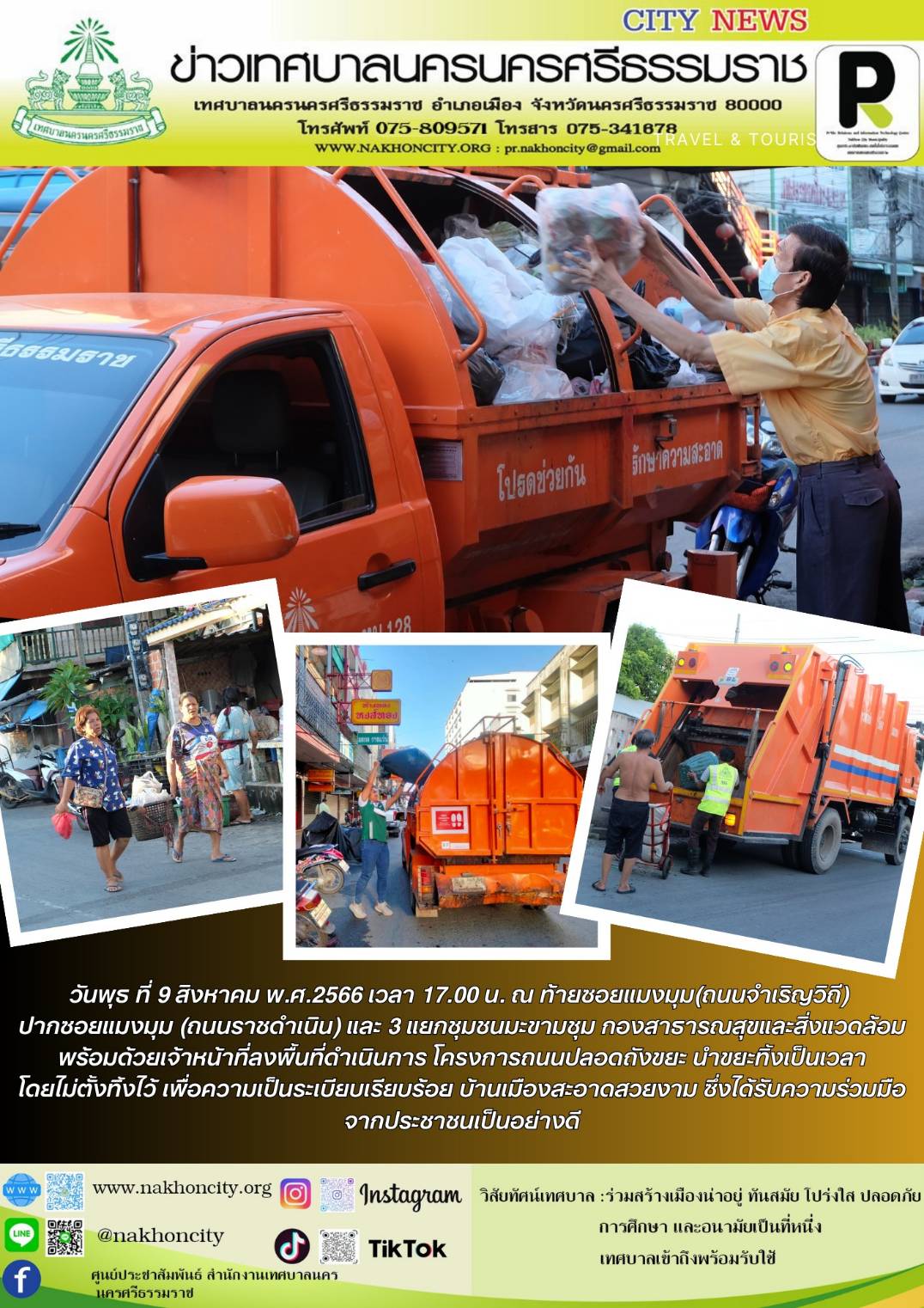 | วันพุธ ที่ 9 สิงหาคม พ.ศ.2566 เวลา 17.00 น. ณ ท้ายซอยแมงมุม(ถนนจำเริญวิถี) ปากซอยแมงมุม (ถนนราชดำเนิน) และ 3 แยกชุมชนมะขามชุม กองสาธารณสุขและสิ่งแวดล้อม พร้อมด้วยเจ้าหน้าที่ลงพื้นที่ดำเนินการ โครงการถนนปลอดถังขยะ นำขยะทิ้งเป็นเวลา โดยไม่ตั้งทิ้งไว้ เพื่อความเป็นระเบียบเรียบร้อย บ้านเมืองสะอาด สวยงาม ซึ่งได้รับความร่วมมือจากประชาชนเป็นอย่างดี .......... ภาพ//ข่าว//จันทร์จิรา |