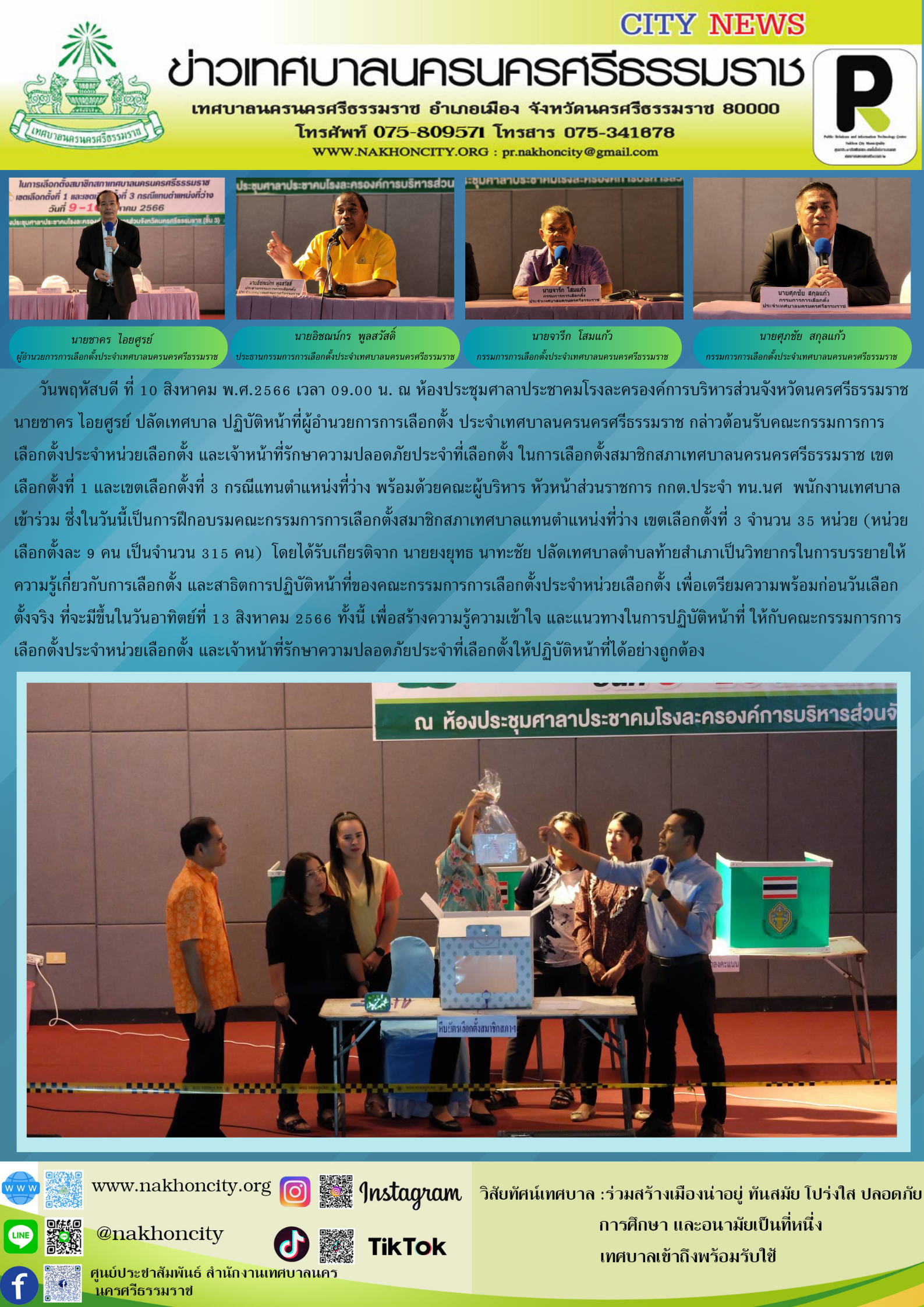 | วันพฤหัสบดี ที่ 10 สิงหาคม พ.ศ.2566 เวลา 09.00 น. ณ ห้องประชุมศาลาประชาคมโรงละครองค์การบริหารส่วนจังหวัดนครศรีธรรมราช นายชาคร ไอยศูรย์ ปลัดเทศบาล ปฏิบัติหน้าที่ผู้อำนวยการการเลือกตั้ง ประจำเทศบาลนครนครศรีธรรมราช กล่าวต้อนรับคณะกรรมการการเลือกตั้งประจำหน่วยเลือกตั้ง และเจ้าหน้าที่รักษาความปลอดภัยประจำที่เลือกตั้ง ในการเลือกตั้งสมาชิกสภาเทศบาลนครนครศรีธรรมราช เขตเลือกตั้งที่ 1 และเขตเลือกตั้งที่ 3 กรณีแทนตำแหน่งที่ว่าง พร้อมด้วย คณะผู้บริหาร หัวหน้าส่วนราชการ กกต.ประจำ ทน.นศ พนักงานเทศบาลเข้าร่วม ซึ่งในวันนี้เป็นการฝึกอบรมคณะกรรมการการเลือกตั้งสมาชิกสภาเทศบาลแทนตำแหน่งที่ว่าง เขตเลือกตั้งที่ 3 จำนวน 35 หน่วย (หน่วยเลือกตั้งละ 9 คน เป็นจำนวน 315 คน) โดยได้รับเกียรติจาก นายยงยุทธ นาทะชัย ปลัดเทศบาลตำบลท้ายสำเภาเป็นวิทยากรในการบรรยายให้ความรู้เกี่ยวกับการเลือกตั้ง และสาธิต การปฏิบัติหน้าที่ของคณะกรรมการการเลือกตั้งประจำหน่วยเลือกตั้ง เพื่อเตรียมความพร้อมก่อนวันเลือกตั้งจริง ที่จะมีขึ้นในวันอาทิตย์ที่ 13 สิงหาคม 2566 ทั้งนี้ เพื่อสร้างความรู้ความเข้าใจ และแนวทางในการปฏิบัติหน้าที่ ให้กับคณะกรรมการการเลือกตั้งประจำหน่วยเลือกตั้ง และเจ้าหน้าที่รักษาความปลอดภัยประจำที่เลือกตั้งให้ปฏิบัติหน้าที่ได้อย่างถูกต้อง