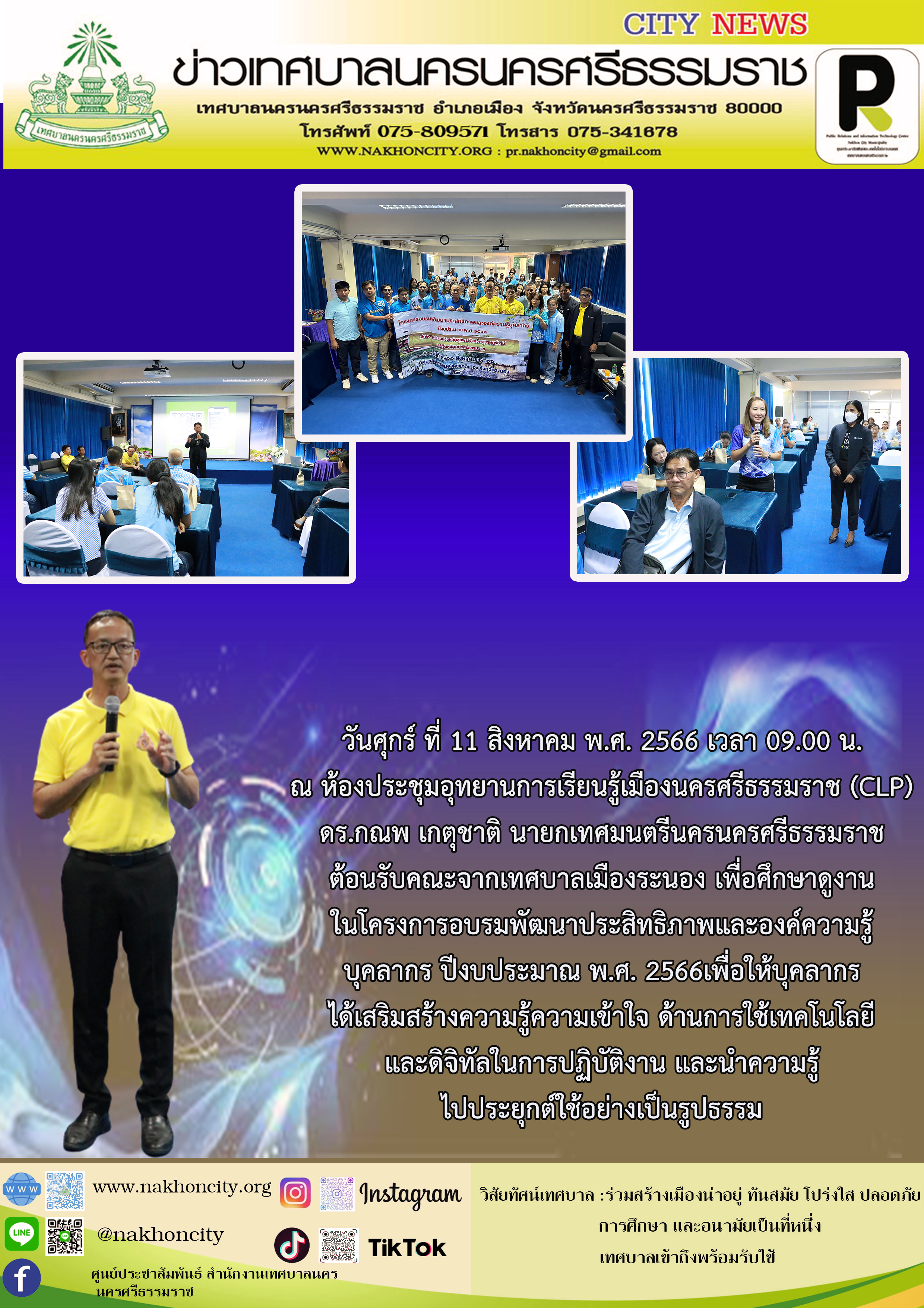 | ดร.กณพ เกตุชาติ นายกเทศมนตรีนครนครศรีธรรมราช ต้อนรับคณะจากเทศบาลเมืองระนอง เพื่อศึกษาดูงานในโครงการอบรมพัฒนาประสิทธิภาพและองค์ความรู้บุคลากร ปีงบประมาณ พ.ศ. 2566 |