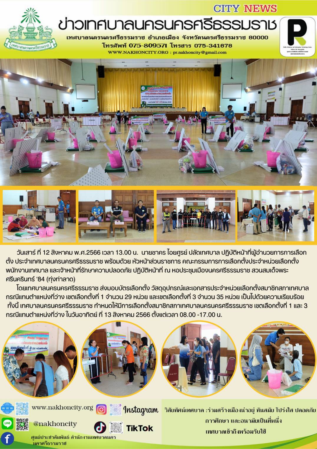 | วันเสาร์ ที่ 12 สิงหาคม พ.ศ.2566 เวลา 13.00 น. นายชาคร ไอยศูรย์ ปลัดเทศบาล ปฏิบัติหน้าที่ผู้อำนวยการการเลือกตั้ง ประจำเทศบาลนครนครศรีธรรมราช พร้อมด้วย หัวหน้าส่วนราชการ คณะกรรมการการเลือกตั้งประจำหน่วยเลือกตั้ง พนักงานเทศบาล และเจ้าหน้าที่รักษาความปลอดภัย ปฏิบัติหน้าที่ ณ หอประชุมเมืองนครศรีธรรมราช สวนสมเด็จพระศรีนครินทร์ ‘84 (ทุ่งท่าลาด) โดยเทศบาลนครนครศรีธรรมราช ส่งมอบบัตรเลือกตั้ง วัสดุอุปกรณ์และเอกสารประจำหน่วยเลือกตั้งสมาชิกสภาเทศบาล กรณีแทนตำแหน่งที่ว่าง เขตเลือกตั้งที่ 1 จำนวน 29 หน่วย และเขตเลือกตั้งที่ 3 จำนวน 35 หน่วย เป็นไปด้วยความเรียบร้อย ทั้งนี้ เทศบาลนครนครศรีธรรมราช กำหนดให้มีการเลือกตั้งสมาชิกสภาเทศบาลนครนครศรีธรรมราช เขตเลือกตั้งที่ 1 และ 3 กรณีแทนตำแหน่งที่ว่าง ในวันอาทิตย์ ที่ 13 สิงหาคม 2566 ตั้งแต่เวลา 08.00 -17.00 น. ............ ภาพ//ข่าว//จันทร์จิรา ตรวจทาน//ฐิตินันท์ |