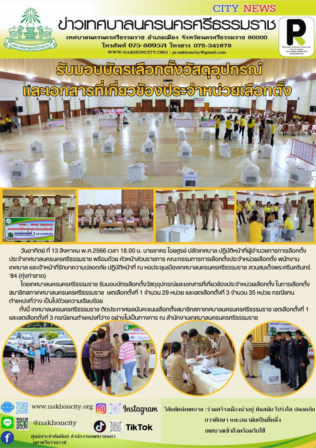 | เทศบาลนครนครศรีธรรมราช รับมอบบัตรเลือกตั้งวัสดุอุปกรณ์และเอกสารที่เกี่ยวข้องประจำหน่วยเลือกตั้ง ในการเลือกตั้งสมาชิกสภาเทศบาลนครนครศรีธรรมราช เขตเลือกตั้งที่ 1 จำนวน 29 หน่วย และเขตเลือกตั้งที่ 3 จำนวน 35 หน่วย กรณีแทนตำแหน่งที่ว่าง เป็นไปด้วยความเรียบร้อย |