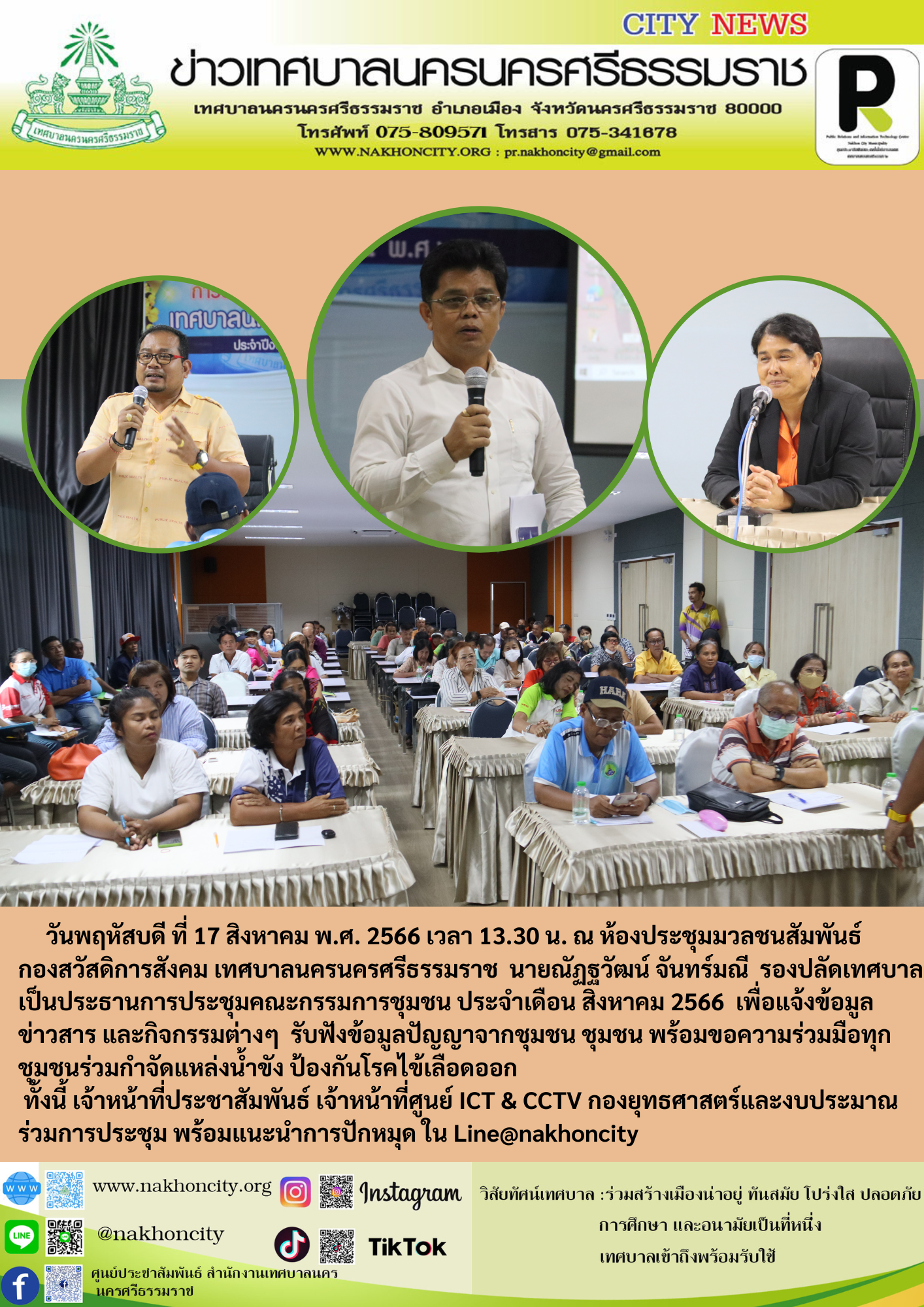 | วันพฤหัสบดี ที่ 17 สิงหาคม พ.ศ. 2566 เวลา 13.30 น. ณ ห้องประชุมมวลชนสัมพันธ์ กองสวัสดิการสังคม เทศบาลนครนครศรีธรรมราช นายณัฏฐวัฒน์ จันทร์มณี รองปลัดเทศบาลเป็นประธานการประชุมคณะกรรมการชุมชน ประจำเดือน สิงหาคม 2566 เพื่อแจ้งข้อมูลข่าวสาร และกิจกรรมต่างๆ รับฟังข้อมูลปัญญาจากชุมชน ชุมชน พร้อมขอความร่วมมือทุกชุมชนร่วมกำจัดแหล่งน้ำขัง ป้องกันโรคไข้เลือดออก ทั้งนี้ เจ้าหน้าที่ประชาสัมพันธ์ เจ้าหน้าที่ศูนย์ ICT & CCTV กองยุทธศาสตร์และงบประมาณ ร่วมการประชุม พร้อมแนะนำการปักหมุด ใน Line@nakhoncity |