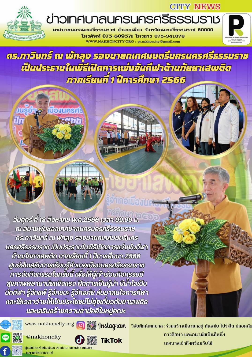 | ดร.ภาวินทร์ ณ พัทลุง รองนายกเทศมนตรีนครนครศรีธรรมราช เป็นประธานในพิธีเปิดการแข่งขันกีฬาต้านภัยยาเสพติด ภาคเรียนที่ 1 ปีการศึกษา 2566 |