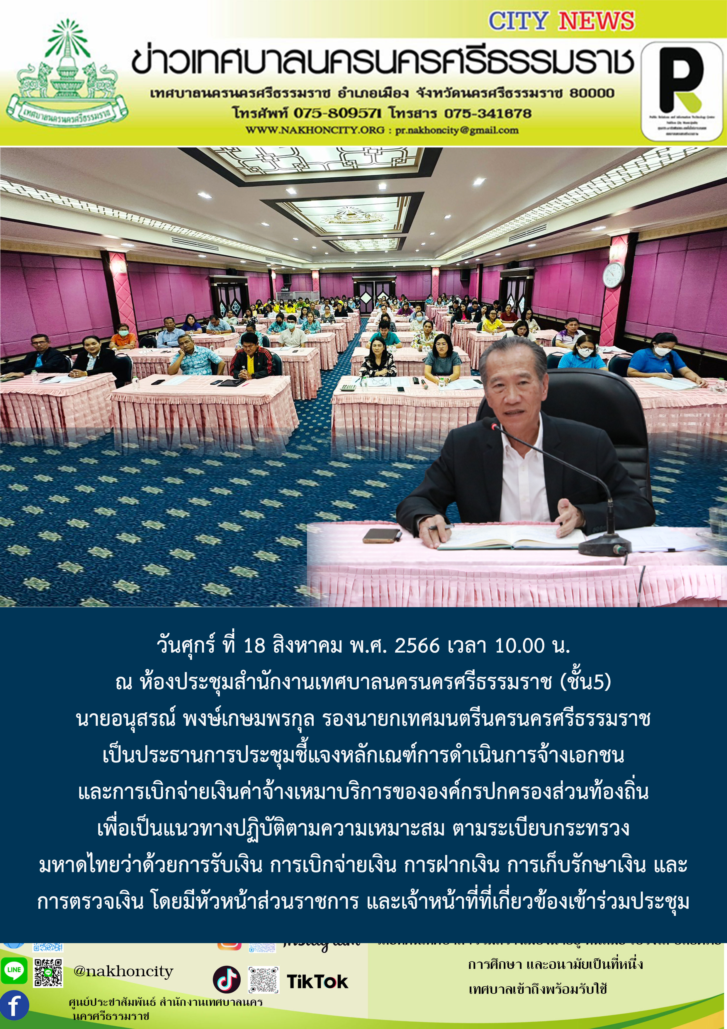 | วันศุกร์ ที่ 18 สิงหาคม พ.ศ. 2566 เวลา 10.00 น. ณ ห้องประชุมสำนักงานเทศบาลนครนครศรีธรรมราช (ชั้น5)