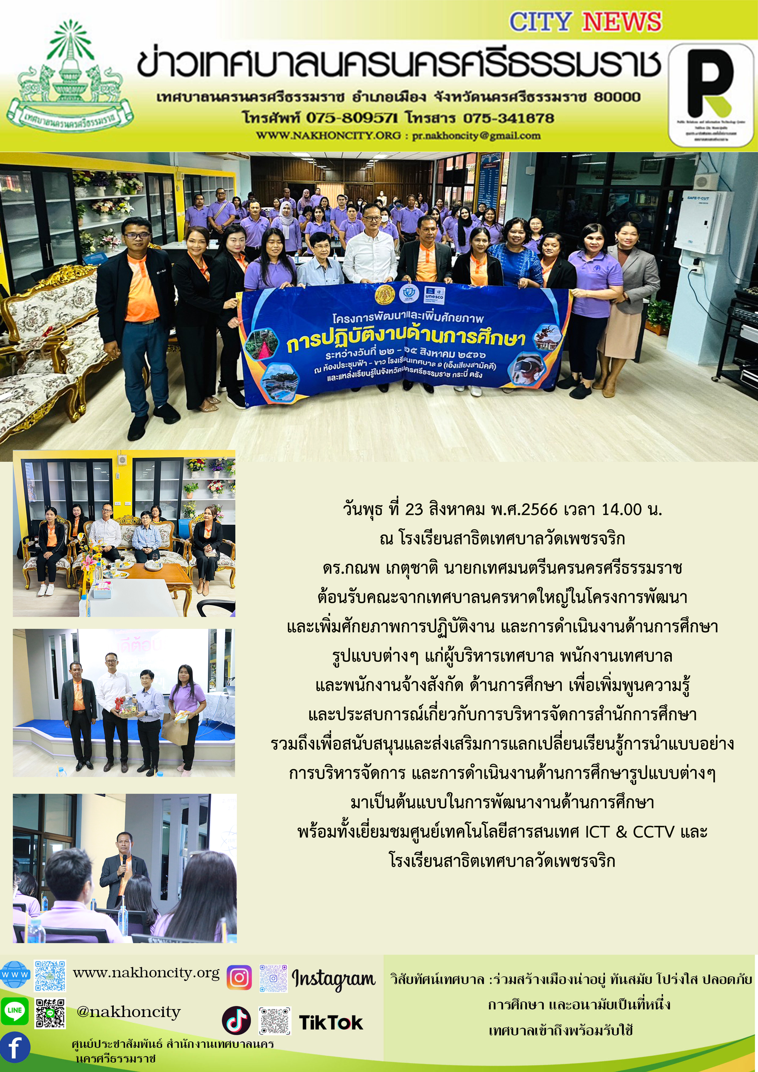 | ดร.กณพ เกตุชาติ นายกเทศมนตรีนครนครศรีธรรมราช ต้อนรับคณะจากเทศบาลนครหาดใหญ่ในโครงการพัฒนาและเพิ่มศักยภาพการปฏิบัติงาน และการดำเนินงานด้านการศึกษารูปแบบต่างๆ แก่ผู้บริหารเทศบาล พนักงานเทศบาล และพนักงานจ้างสังกัด ด้านการศึกษา |
