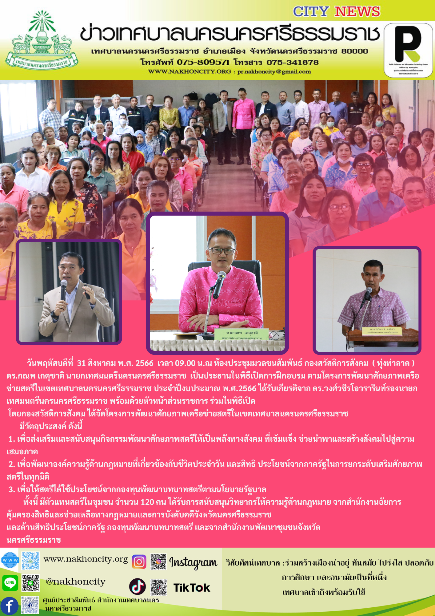 | วันพฤหัสบดีที่ 31 สิงหาคม พ.ศ. 2566 เวลา 09.00 น. ณ ห้องประชุมมวลชนสัมพันธ์ กองสวัสดิการสังคม ดร.กณพ เกตุชาติ นายกเทศมนตรีนครนครศรีธรรมราช เป็นประธานในพิธีเปิดการฝึกอบรม ตามโครงการพัฒนาศักยภาพเครือข่ายสตรีในเขตเทศบาลนครนครศรีธรรมราช ประจำปีงบประมาณ พ.ศ.2566 ได้รับเกียรติจาก ดร.วงศ์วชิร โอวรารินท์ รองนายกเทศมนตรีนครนครศรีธรรมราช พร้อมด้วยหัวหน้าส่วนราชการ ร่วมในพิธีเปิด โดยกองสวัสดิการสังคม ได้จัดโครงการพัฒนาศักยภาพเครือข่ายสตรีในเขตเทศบาลนครนครศรีธรรมราช โดยมีวัตถุประสงค์ ดังนี้ 1. เพื่อส่งเสริมและสนับสนุนกิจกรรมพัฒนาศักยภาพสตรีให้เป็นพลังทางสังคม ที่เข้มแข็ง ช่วยนำพาและสร้างสังคมไปสู่ความเสมอภาค 2. เพื่อพัฒนาองค์ความรู้ด้านกฎหมายที่เกี่ยวข้องกับชีวิตประจำวัน และสิทธิ ประโยชน์จากภาครัฐในการยกระดับเสริมศักยภาพสตรีในทุกมิติ 3. เพื่อให้สตรีได้ใช้ประโยชน์จากกองทุนพัฒนาบทบาทสตรีตามนโยบายรัฐบาล ทั้งนี้ มีตัวแทนสตรีในชุมชน จำนวน 120 คน ได้รับการสนับสนุนวิทยากรให้ความรู้ด้านกฎหมาย จากสำนักงานอัยการคุ้มครองสิทธิและช่วยเหลือทางกฎหมายและการบังคับคดีจังหวัดนครศรีธรรมราช และด้านสิทธิประโยชน์ภาครัฐ กองทุนพัฒนาบทบาทสตรี และจากสำนักงานพัฒนาชุมชนจังหวัด นครศรีธรรมราช |