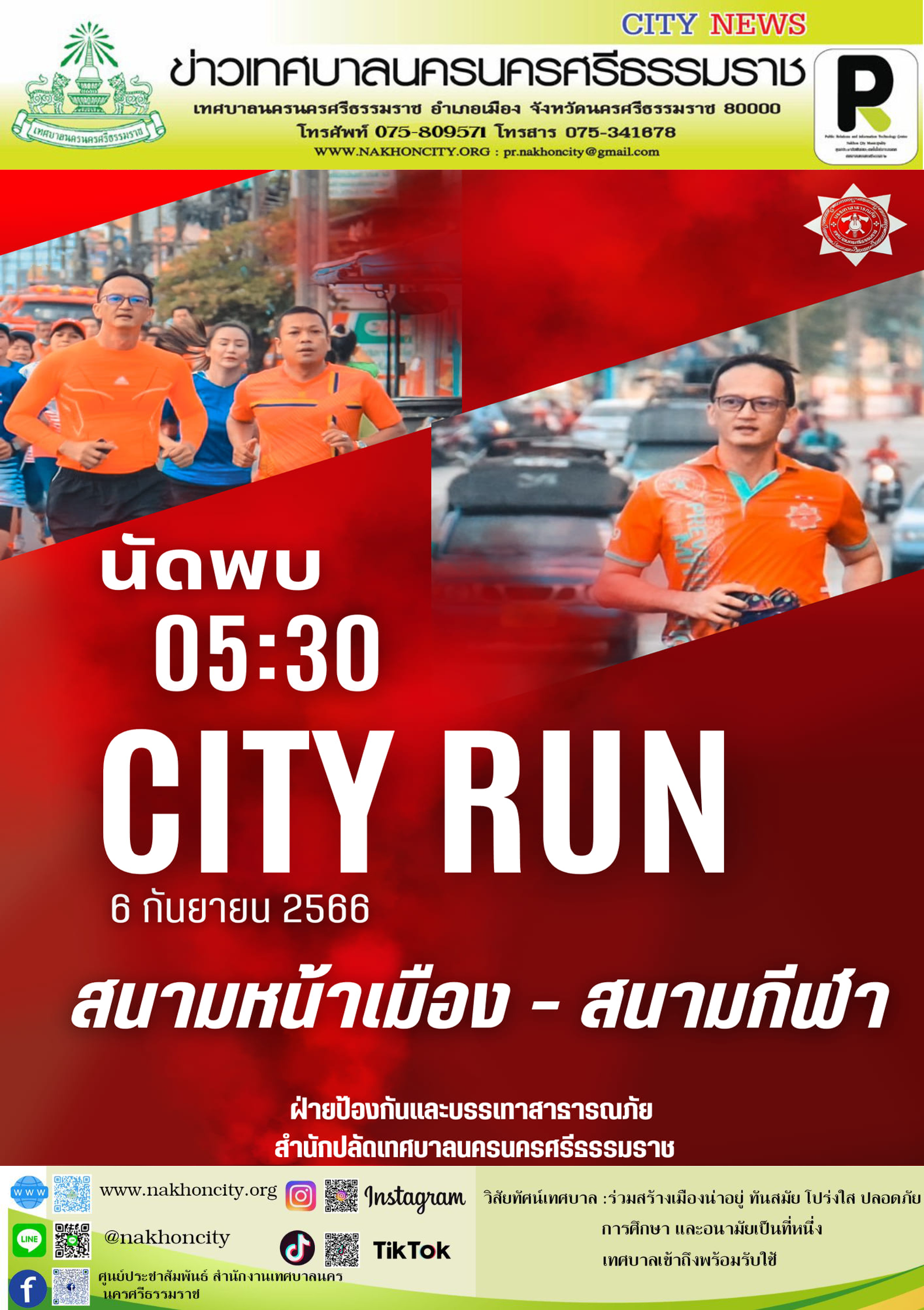 | เทศบาลนครนครศรีธรรมราช ขอเชิญชวนประชาชนร่วมกิจกรรม "CITY RUN" วันพุธที่ 6 กันยายน 2566 |