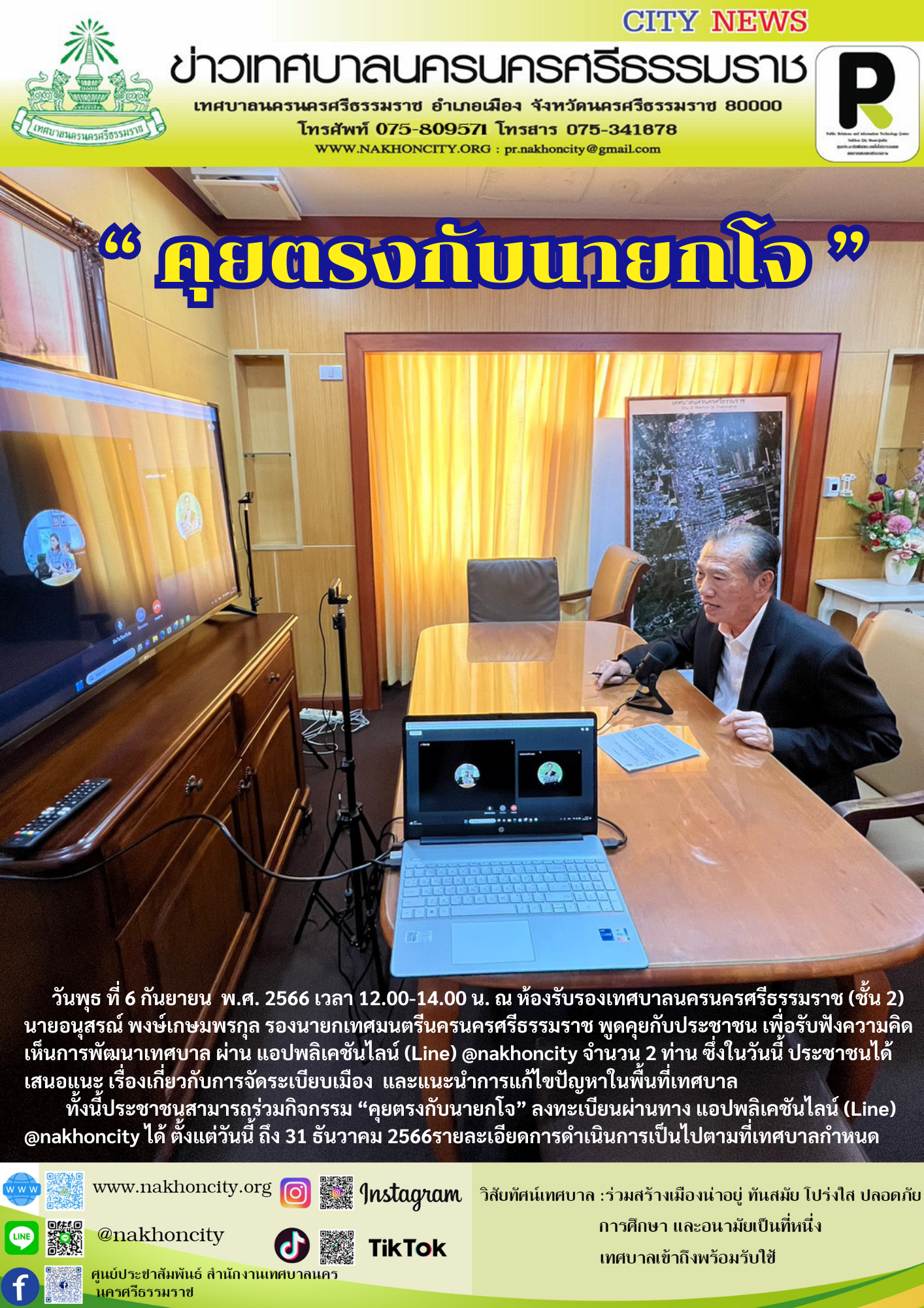 | นายอนุสรณ์ พงษ์เกษมพรกุล รองนายกเทศมนตรีนครนครศรีธรรมราช พูดคุยกับประชาชน เพื่อรับฟังความคิดเห็นการพัฒนาเทศบาล ผ่าน แอปพลิเคชันไลน์ (Line) ในกิจกรรม “คุยตรงกับนายกโจ” |