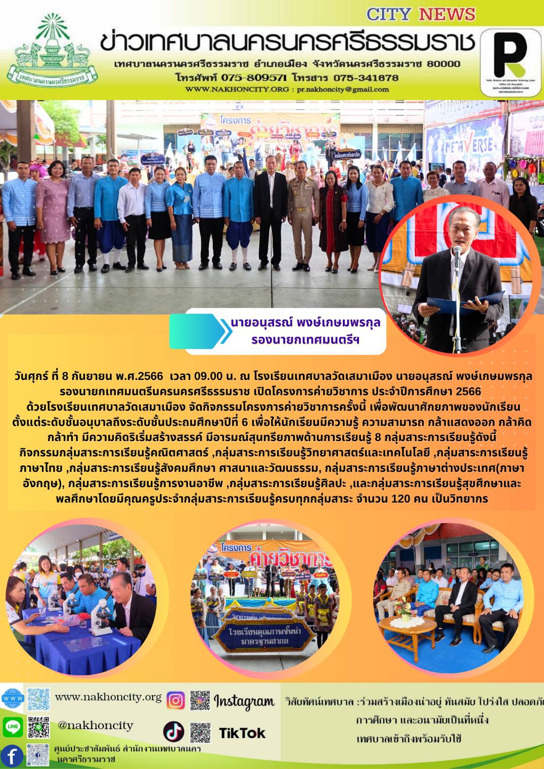 | นายอนุสรณ์ พงษ์เกษมพรกุล รองนายกเทศมนตรีนครนครศรีธรรมราช เปิดโครงการค่ายวิชาการ ประจำปีการศึกษา 2566 โรงเรียนเทศบาลวัดเสมาเมือง |