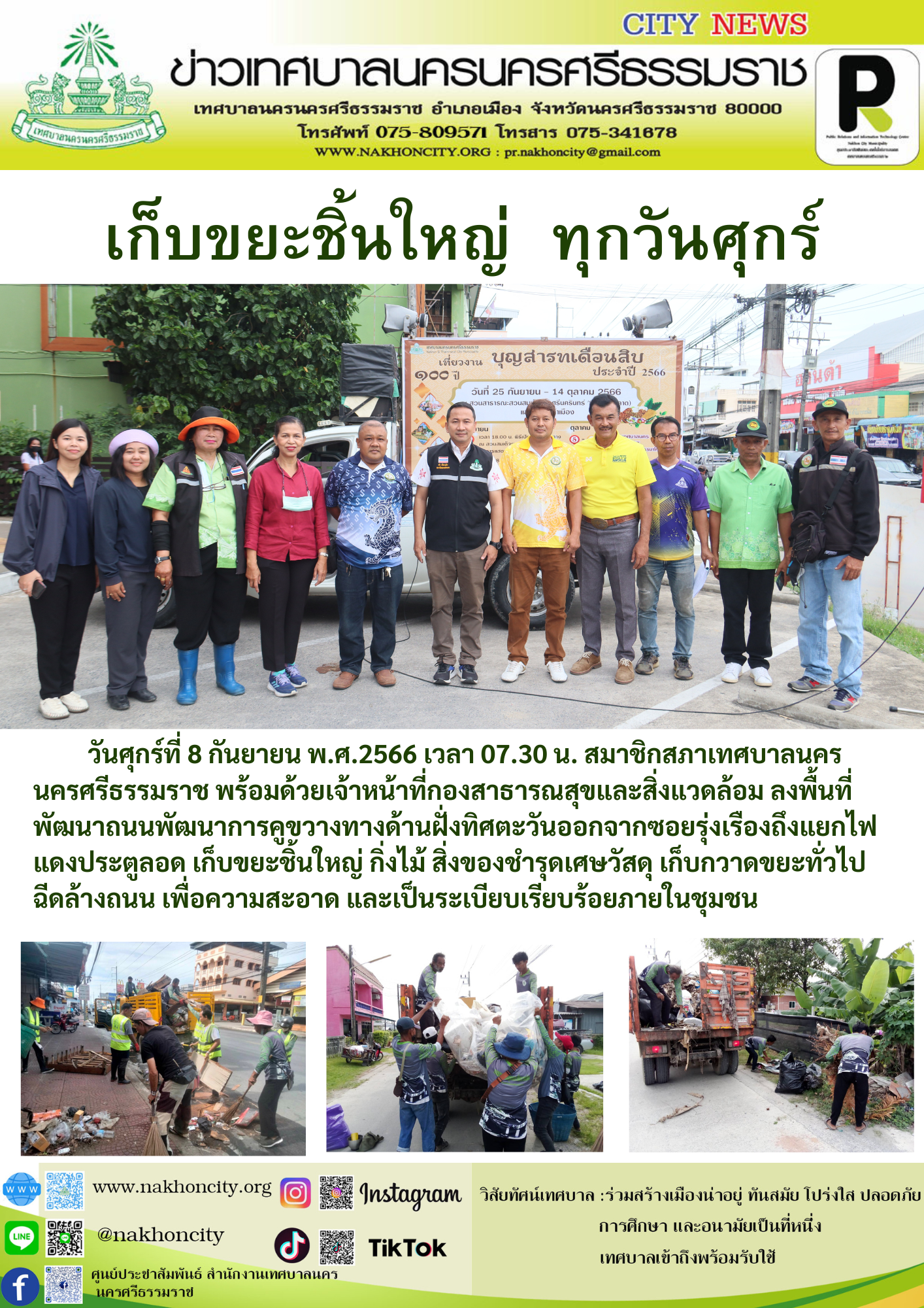 | วันศุกร์ที่ 8 กันยายน พ.ศ.2566 เวลา 07.30 น. สมาชิกสภาเทศบาลนครนครศรีธรรมราช พร้อมด้วยเจ้าหน้าที่กองสาธารณสุขและสิ่งแวดล้อม ลงพื้นที่พัฒนาถนนพัฒนาการคูขวางทางด้านฝั่งทิศตะวันออกจากซอยรุ่งเรืองถึงแยกไฟแดงประตูลอด เก็บขยะชิ้นใหญ่ กิ่งไม้ สิ่งของชำรุดเศษวัสดุ เก็บกวาดขยะทั่วไป ฉีดล้างถนน เพื่อความสะอาด และเป็นระเบียบเรียบร้อยภายในชุมชน |