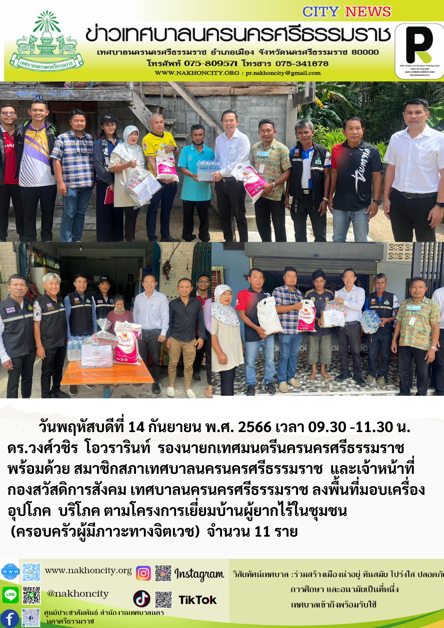 | ดร.วงศ์วชิร โอวรารินท์ รองนายกเทศมนตรีนครนครศรีธรรมราช พร้อมด้วย สมาชิกสภาเทศบาลนครนครศรีธรรมราช และเจ้าหน้าที่กองสวัสดิการสังคม เทศบาลนครนครศรีธรรมราช ลงพื้นที่มอบเครื่องอุปโภค บริโภค ตามโครงการเยี่ยมบ้านผู้ยากไร้ในชุมชน (ครอบครัวผู้มีภาวะทางจิตเวช) |